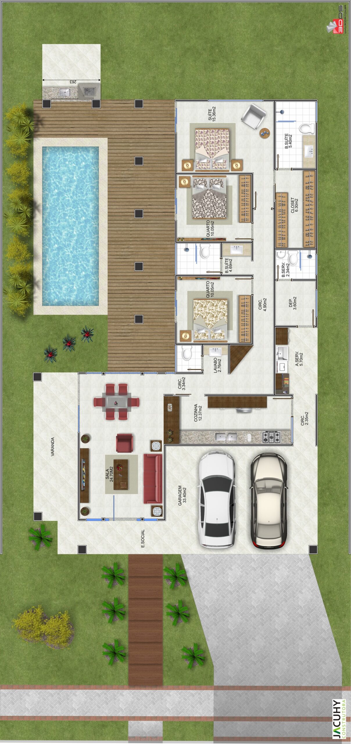 A garagem coberta comporta dois veículos (30,00m²), e a área de serviço é dividida em dois setores, com lavanderia e dependência. O projeto também inclui depósito e circulação técnica, otimizando o uso do espaço e facilitando a manutenção da casa.
