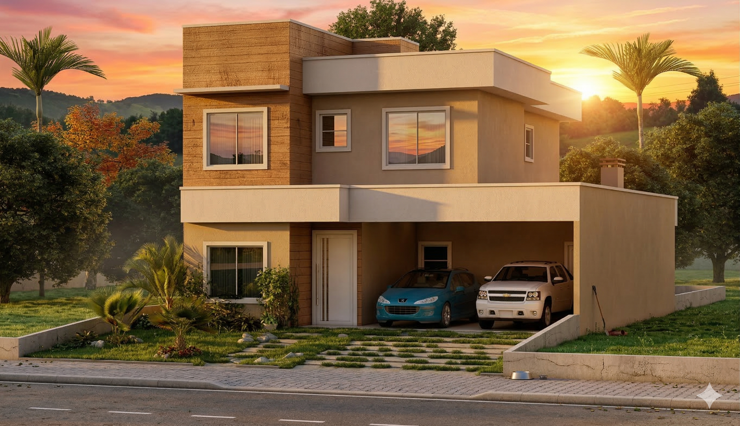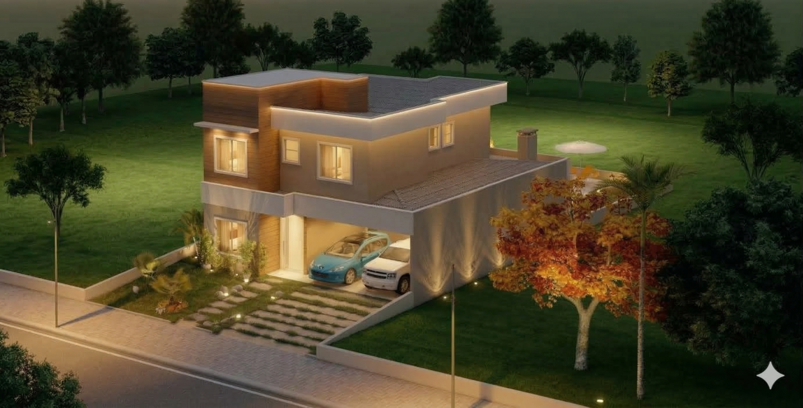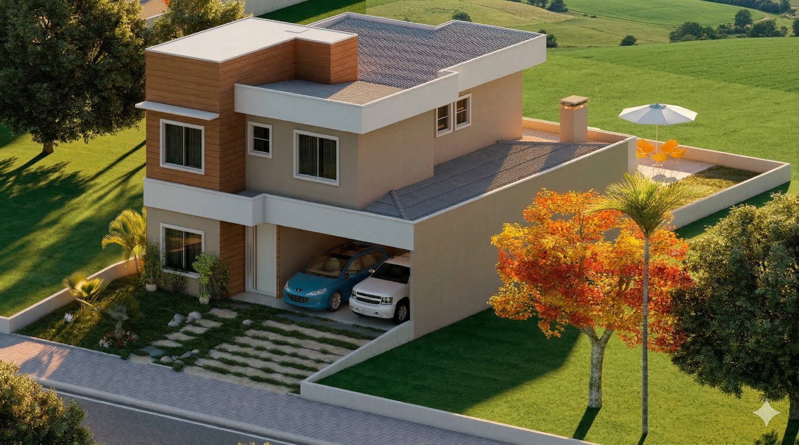 O projeto ainda conta com garagem para 2 carros, além de um layout inteligente que se adapta perfeitamente a terrenos com 12 metros de largura.