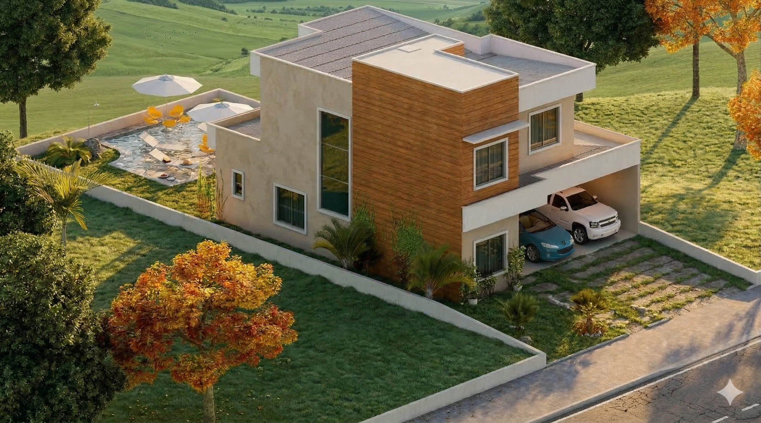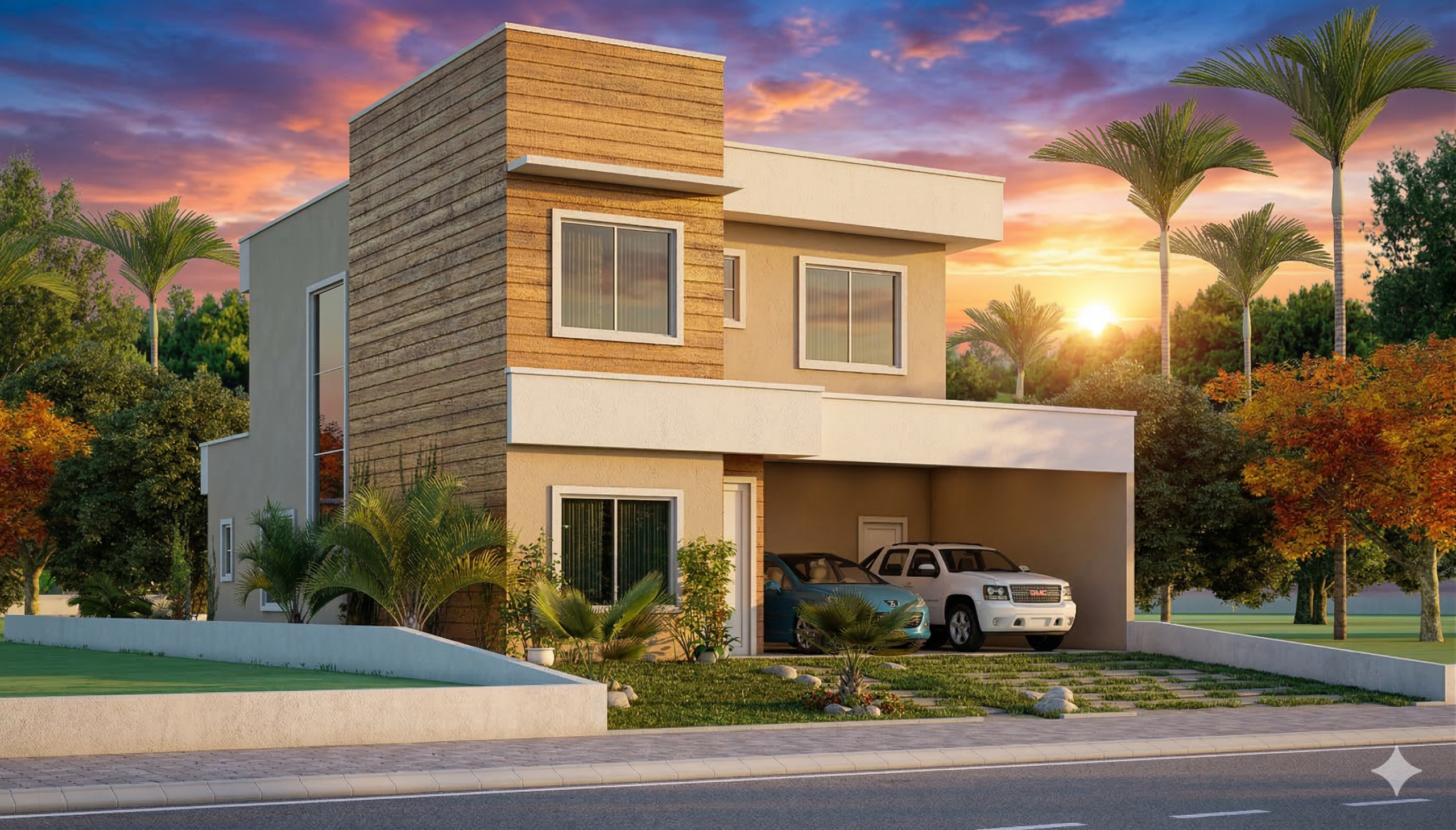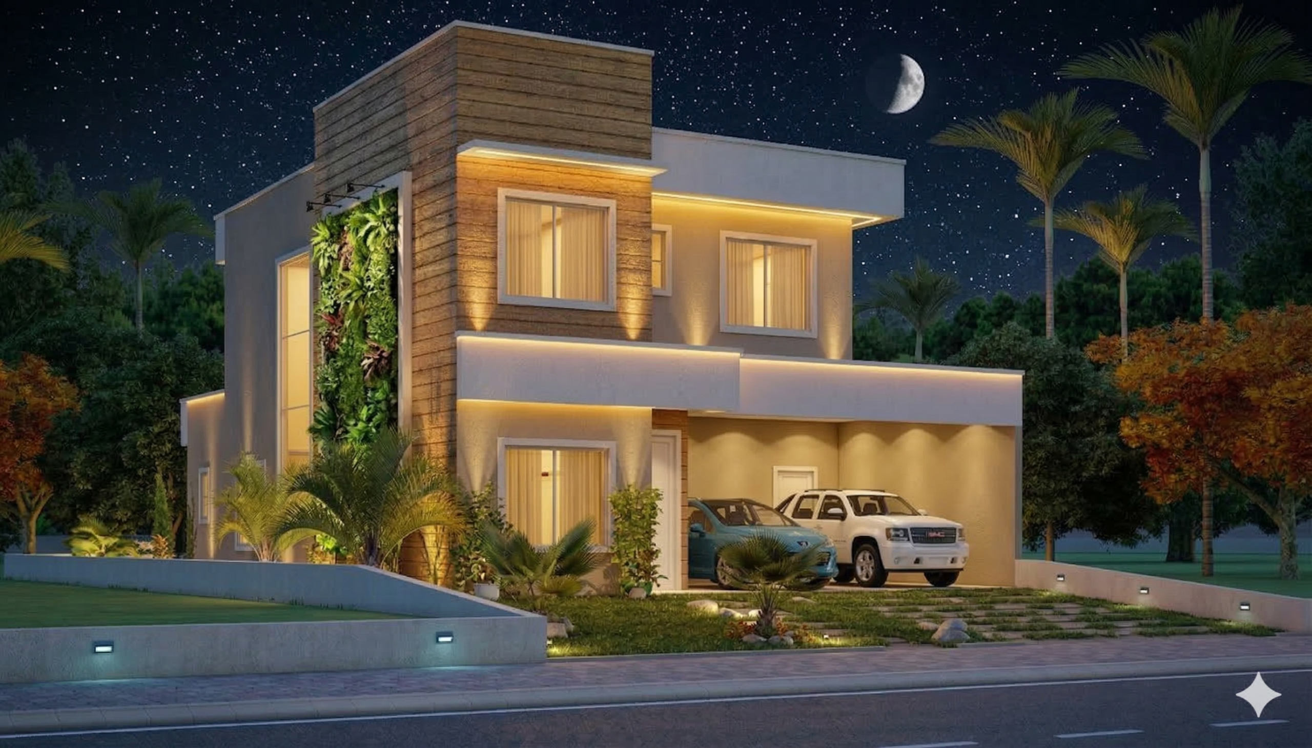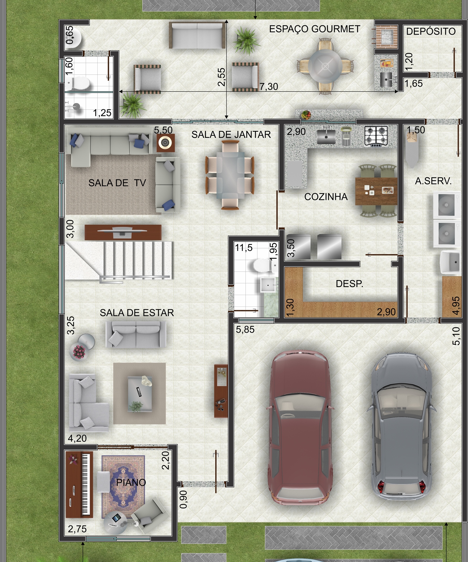 O projeto ainda conta com garagem para 2 carros, além de um layout inteligente que se adapta perfeitamente a terrenos com 12 metros de largura.