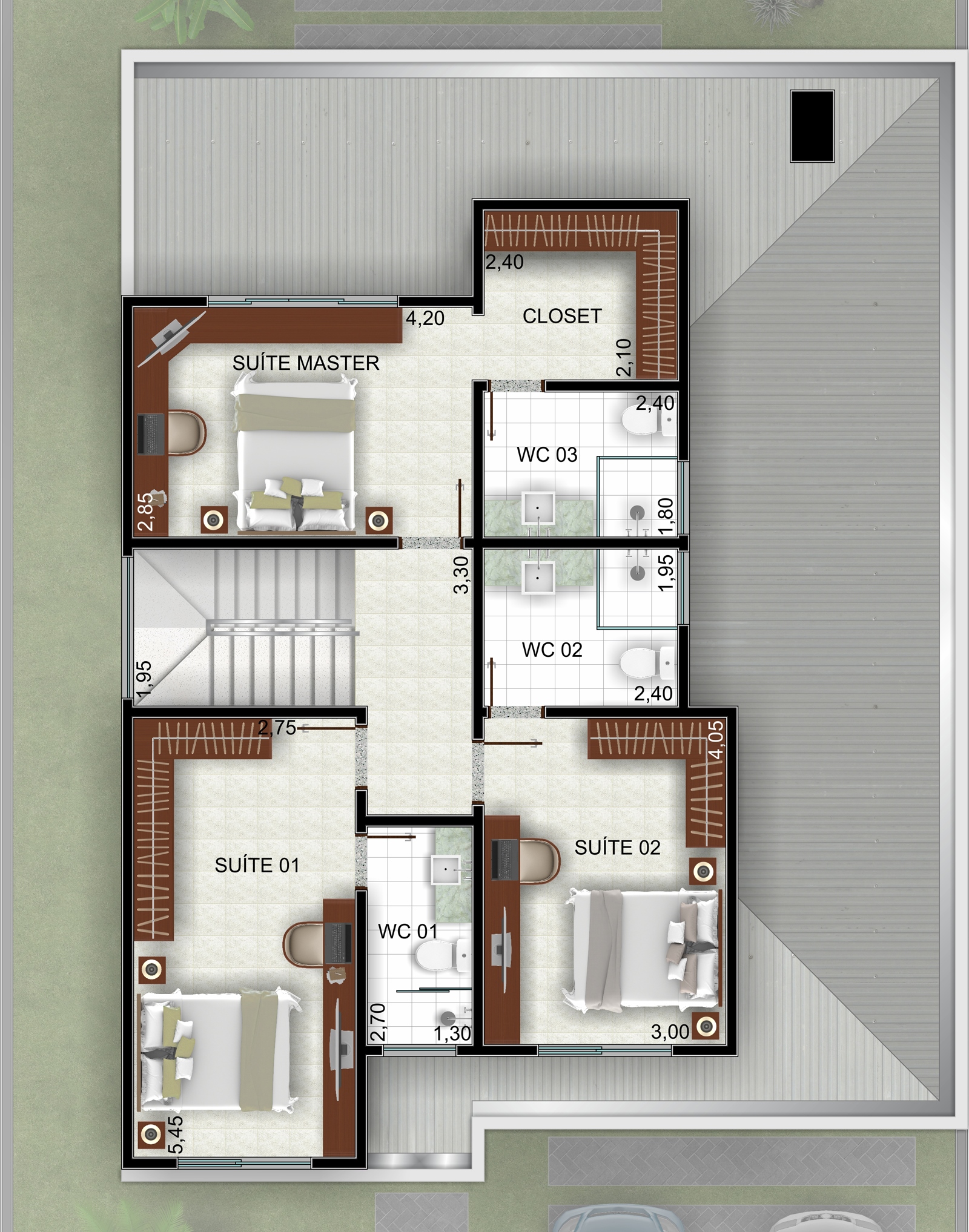 No pavimento superior, encontram-se as três suítes, incluindo uma suíte principal com ótimo espaço e conforto. A distribuição dos ambientes garante privacidade e uma circulação eficiente.