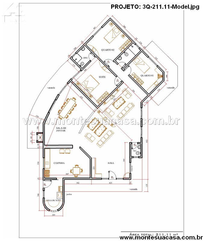 Este projeto residencial de 211,11 m² apresenta uma planta inteligente e acolhedora, ideal para famílias que valorizam espaços bem distribuídos e integração com áreas externas.