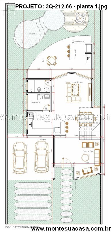 O paisagismo valoriza o projeto com palmeiras, arbustos e floreiras que emolduram a construção. A implantação em terreno plano facilita a execução da obra e permite adaptações conforme a necessidade do cliente.