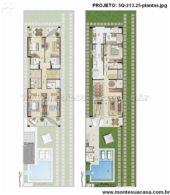 As plantas do projeto demonstram um excelente aproveitamento do terreno e uma distribuição inteligente dos cômodos. A área social é ampla e integrada, promovendo um ambiente perfeito para receber amigos e desfrutar em família. Os ambientes fluem naturalmente uns para os outros, facilitando a circulação e enriquecendo a experiência espacial. Os dormitórios são estrategicamente posicionados para assegurar privacidade e tranquilidade, constituindo um refúgio particular para os moradores.