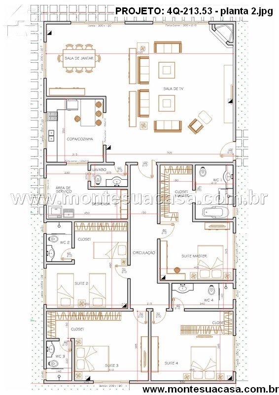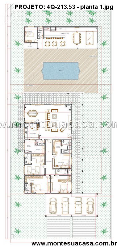 Logo na entrada, o hall conduz para uma sala de estar espaçosa integrada à sala de jantar, permitindo fluidez entre os ambientes. O layout favorece encontros familiares e convivência social sem interrupções visuais. A cozinha funcional se posiciona estrategicamente para atender tanto a área interna quanto a área gourmet localizada nos fundos. Nesta área externa, o projeto inclui churrasqueira, bancada de apoio e espaço coberto, facilitando eventos sociais ao lado da piscina.