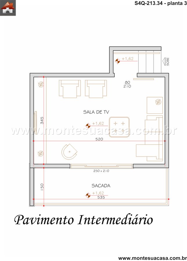 O pavimento intermediário é dedicado ao convívio e ao lazer. Ele abriga uma espaçosa sala de TV, criando um refúgio perfeito para a família. Além disso, este andar conta com uma generosa sacada, uma extensão da área social que permite o contato com o exterior e é ideal para momentos de descontração. A circulação entre os cômodos é fluida, facilitando o dia a dia e a interação entre os moradores.