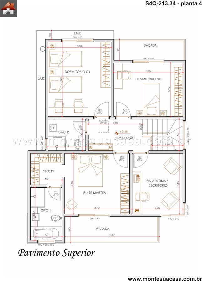 O pavimento superior é o domínio da privacidade, abrigando os quatro dormitórios. A suite master é um verdadeiro oásis de descanso, com dimensões generosas, closet planejado e banheiro privativo. As outras duas suítes oferecem conforto e praticidade, enquanto o quarto adicional pode ser adaptado como dormitório ou escritório, conforme a necessidade da família. O projeto também inclui uma sala íntima, que pode funcionar como um escritório ou um espaço de leitura, oferecendo versatilidade.