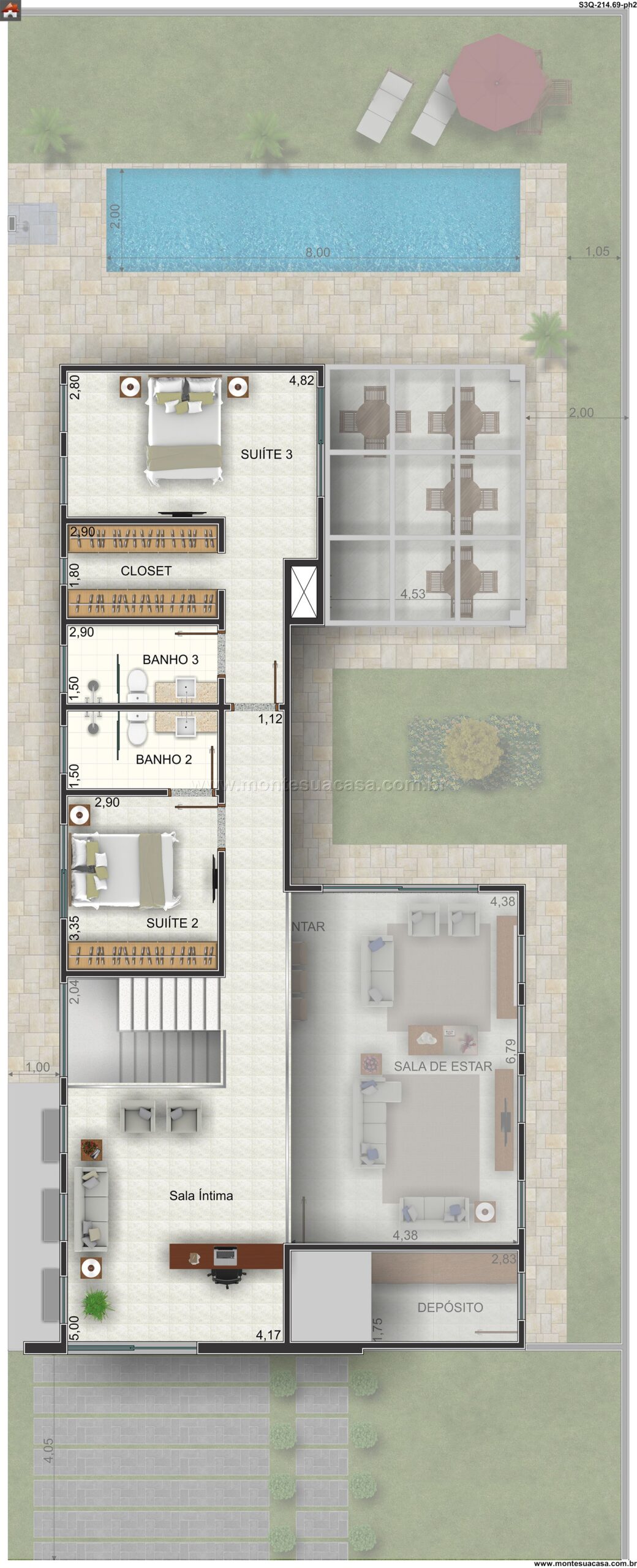 No pavimento térreo, localiza-se a suíte 1, oferecendo privacidade e conveniência. A área de serviço, com lavanderia e despensa, é bem organizada para o dia a dia. Subindo para o pavimento superior, o setor íntimo se revela com duas suítes adicionais, incluindo a suíte master. Esta conta com um closet exclusivo, proporcionando um refúgio pessoal. Um banho social bem localizado atende a este pavimento, complementado por um depósito para maior organização.