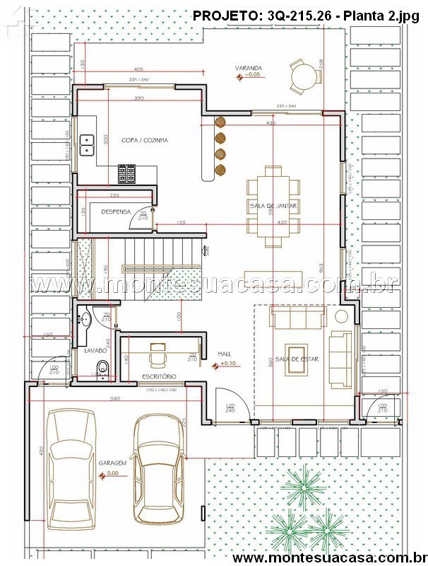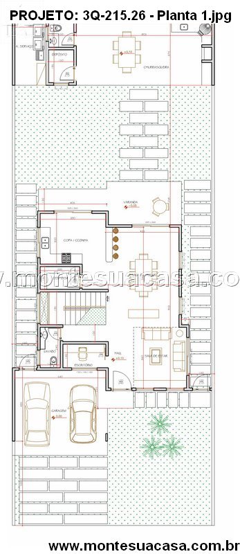 Projeto moderno com 3 suítes, varanda gourmet, escritório e garagem para 2 carros. Ideal para terrenos a partir de 10m de frente.