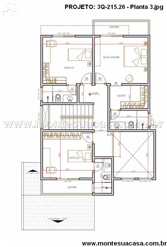 No pavimento superior, o projeto oferece três suítes confortáveis, incluindo uma suíte master com closet e sacada privativa. Os banheiros são bem distribuídos e otimizados para garantir conforto e praticidade. A circulação vertical é feita por uma escada central com iluminação zenital, que valoriza o projeto e proporciona leveza ao ambiente.