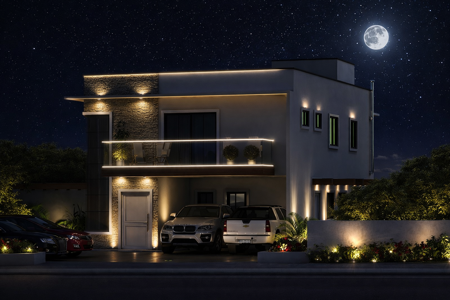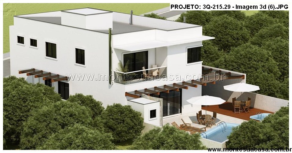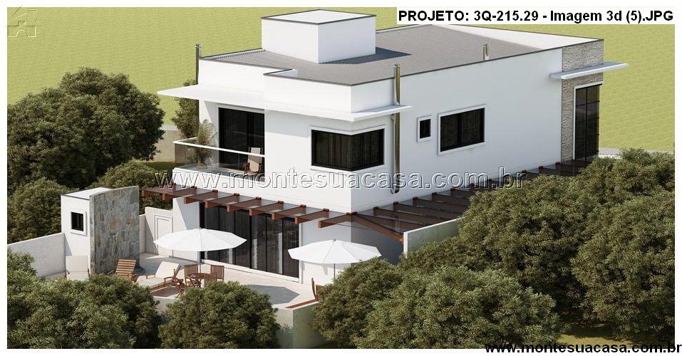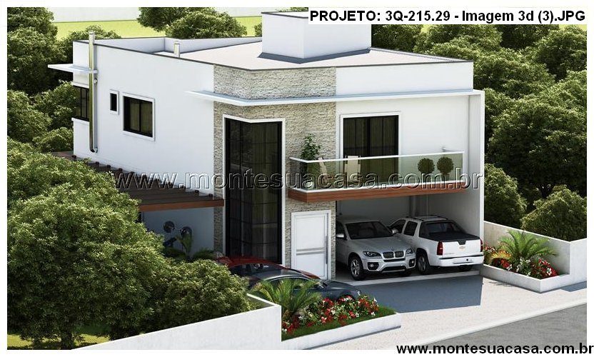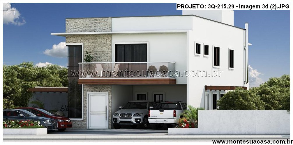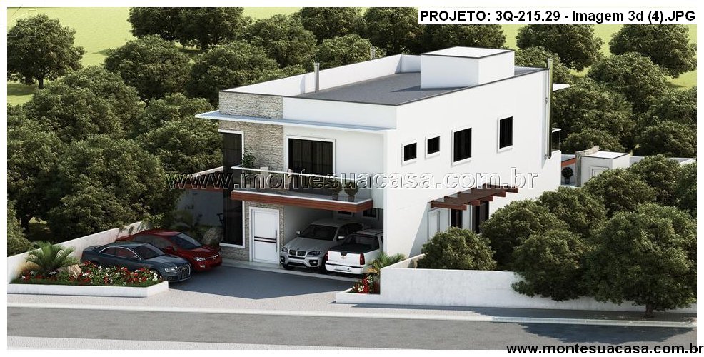 O projeto 3Q-215.29 é uma residência de dois pavimentos com 215,29m² de área construída, ideal para famílias que valorizam sofisticação, funcionalidade e lazer. A fachada moderna combina revestimentos em pedra natural, pintura branca e grandes aberturas em vidro, criando um visual elegante e acolhedor.
