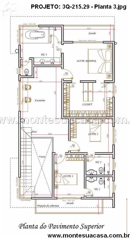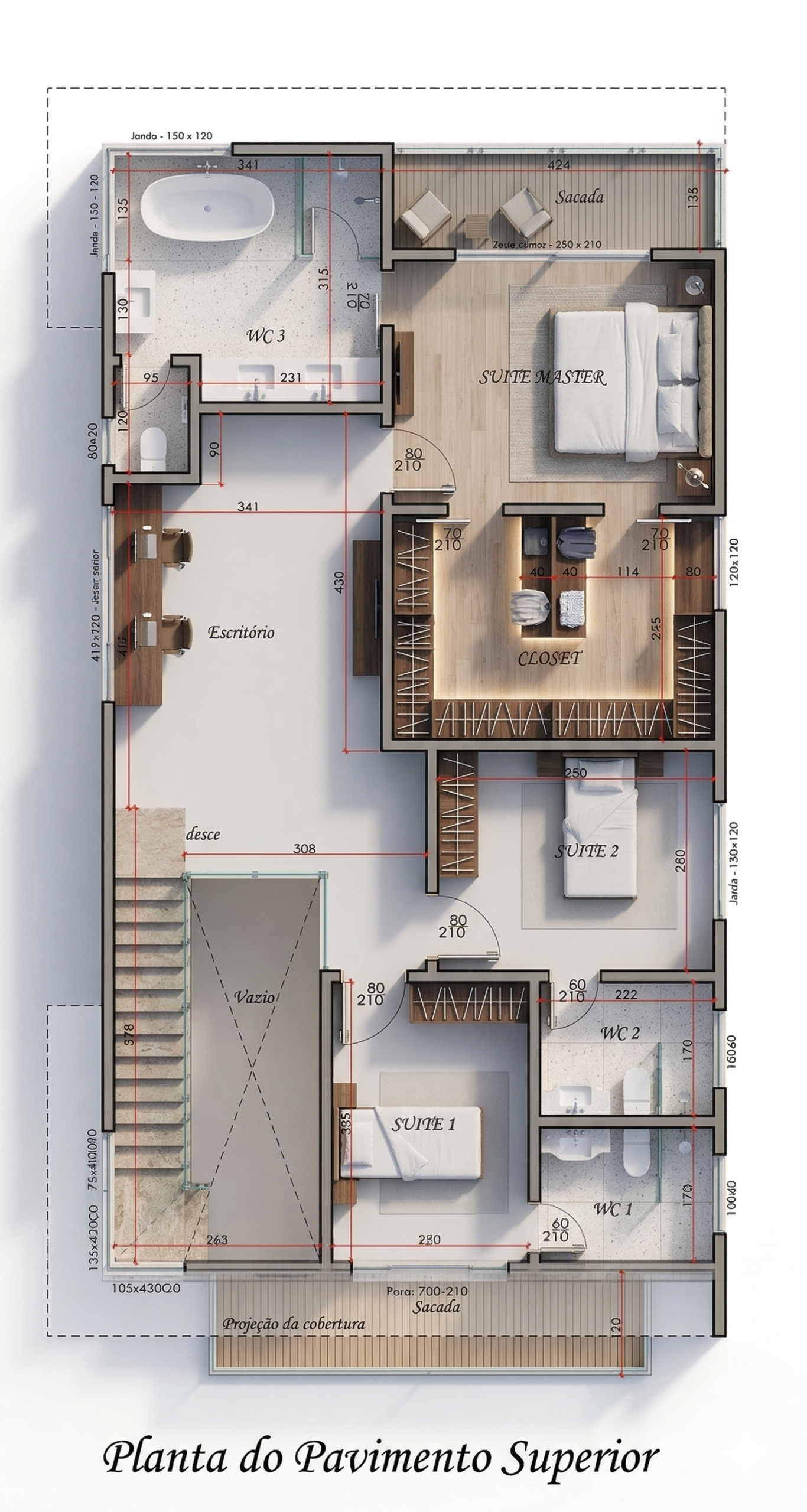 O andar superior abriga três suítes amplas e bem distribuídas. A suíte master oferece closet, escritório privativo, sacada e banheiro com banheira e duas cubas. As outras duas suítes também contam com sacadas e banheiros privativos. O vazio central sobre a escada proporciona pé-direito duplo, favorecendo a ventilação cruzada e a iluminação natural.