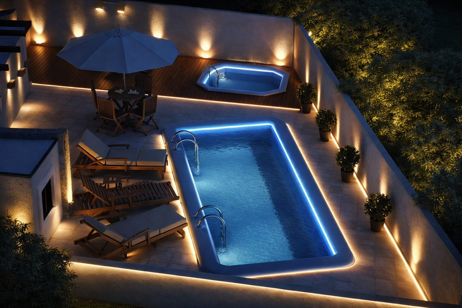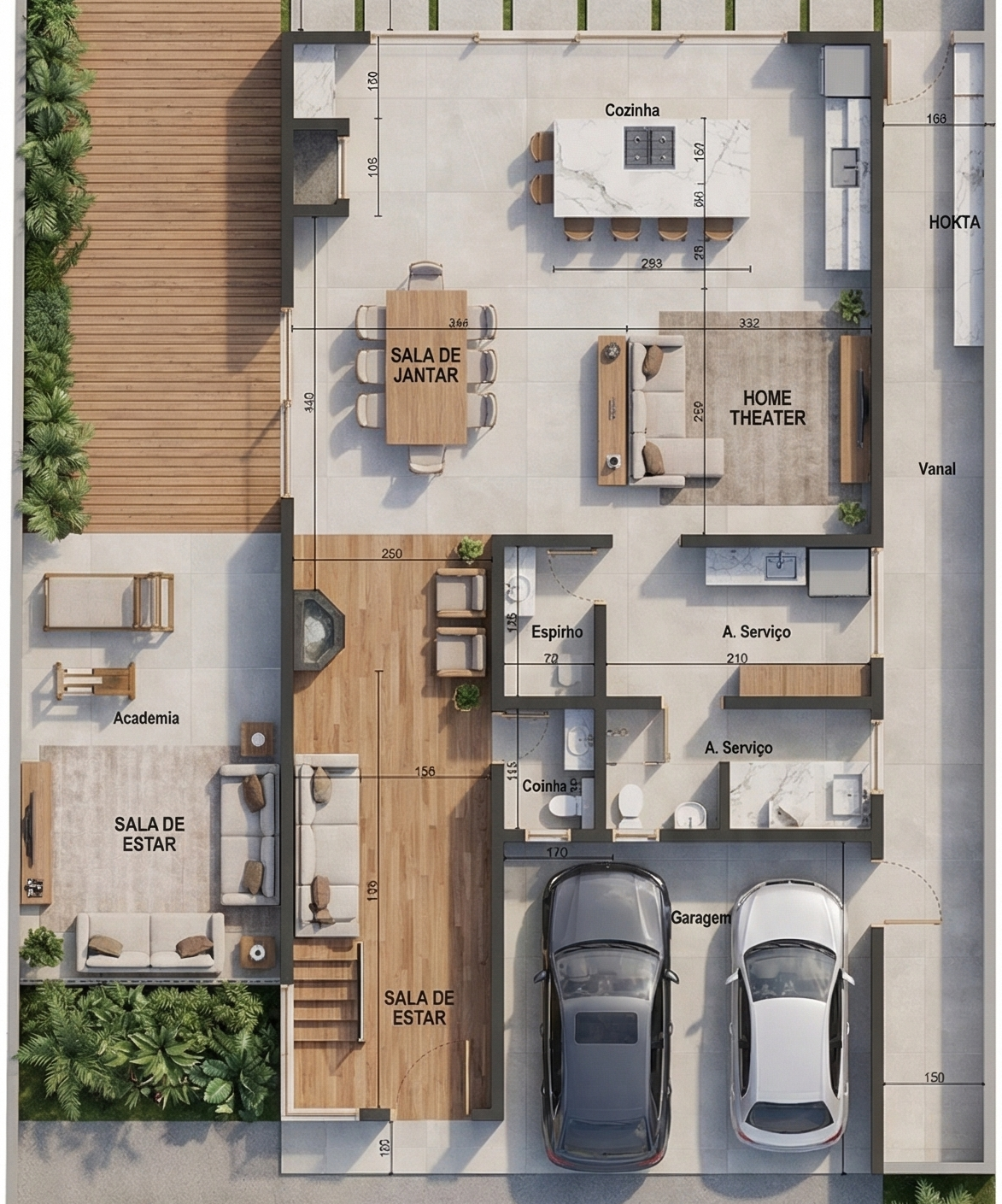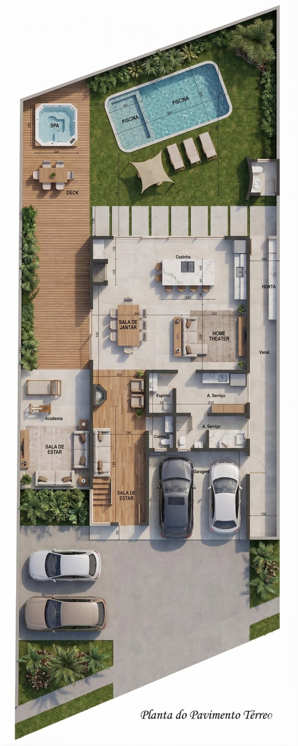 No pavimento térreo, o destaque é a integração dos ambientes sociais. A sala de estar e jantar se conectam à cozinha com ilha central, formando um espaço fluido e convidativo. A área gourmet com churrasqueira se abre para o deck em madeira, que envolve a piscina e o SPA, criando um ambiente perfeito para momentos de lazer e convivência. A garagem coberta comporta dois veículos, com vagas adicionais no jardim frontal.
