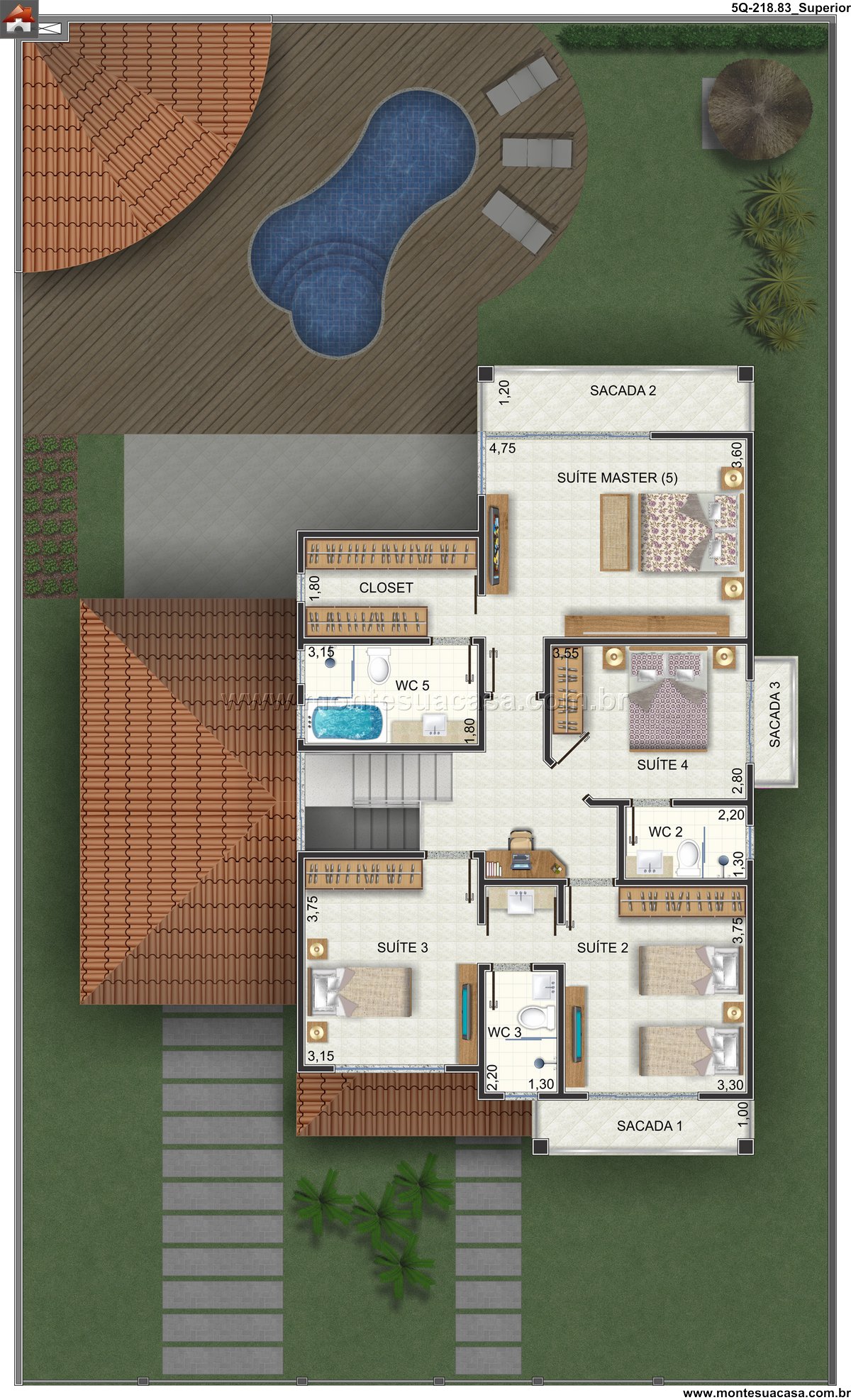 O pavimento superior abriga cinco suítes, incluindo suíte master com closet exclusivo e sacada privativa. Todas as suítes possuem layouts generosos e ventilação cruzada. Dois banheiros sociais atendem com excelência às necessidades dos moradores. As sacadas oferecem espaços adicionais de contemplação e descanso. Esta configuração garante privacidade e conforto para todos os residentes.