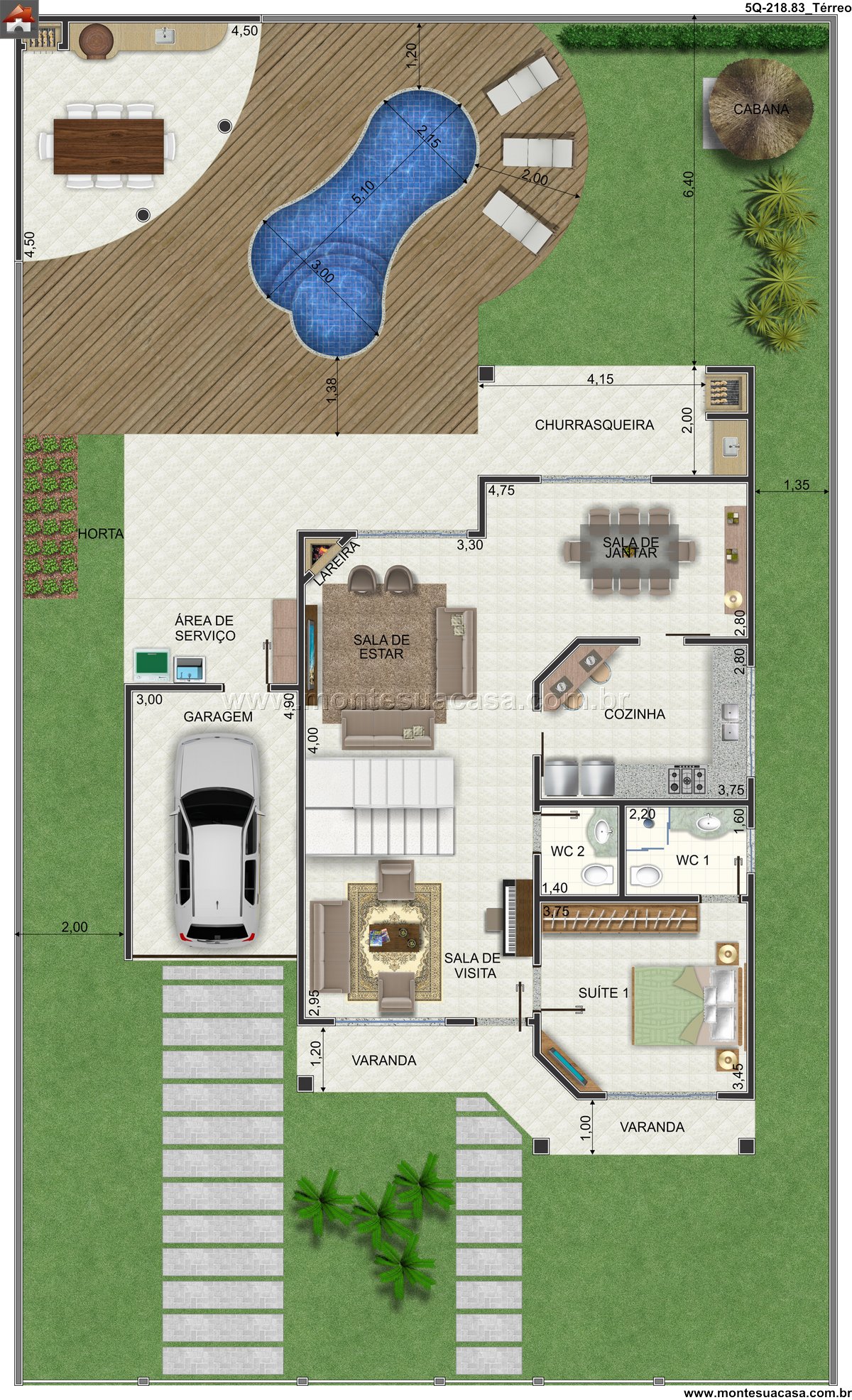 No pavimento térreo, o sobrado oferece ampla sala de estar integrada à área gourmet e cozinha moderna. O projeto inclui ainda cabana independente, perfeita para momentos de relaxamento ou hospedagem. Os espaços foram cuidadosamente dimensionados para proporcionar circulação fluida e aproveitamento máximo da área. A conexão entre ambientes internos e externos cria uma experiência residencial única e aconchegante.