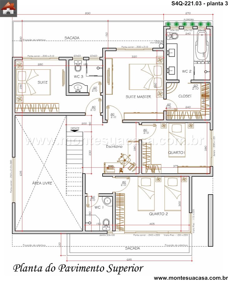 O pavimento superior abriga os quatro quartos, incluindo uma suíte master com closet integrado, garantindo privacidade e conforto para os moradores. Os demais quartos são igualmente aconchegantes e bem iluminados, compartilhando um banheiro social bem distribuído. Um escritório ou quarto de hóspedes complementa este andar, adicionando versatilidade ao layout. Os materiais de acabamento foram selecionados para promover durabilidade e um visual atemporal, com pisos de alto padrão e iluminação estrategicamente planejada.