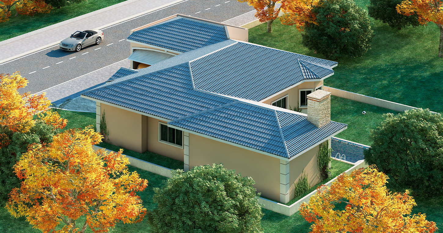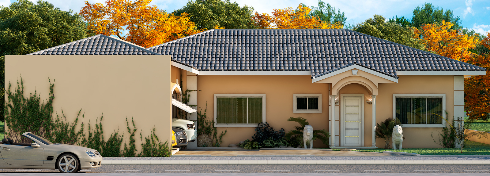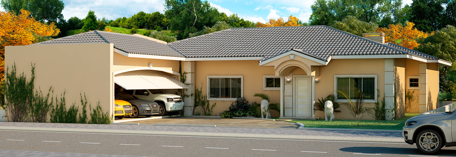 Projeto residencial térreo com foco em funcionalidade e lazer Este projeto de casa térrea com 222,19m² foi desenvolvido para oferecer conforto, praticidade e integração entre os ambientes. A fachada apresenta linhas modernas, com telhado em múltiplas águas e acabamento em tons neutros que harmonizam com o paisagismo ao redor. A entrada principal é marcada por colunas decorativas e esculturas de leões, conferindo um toque clássico à composição contemporânea.