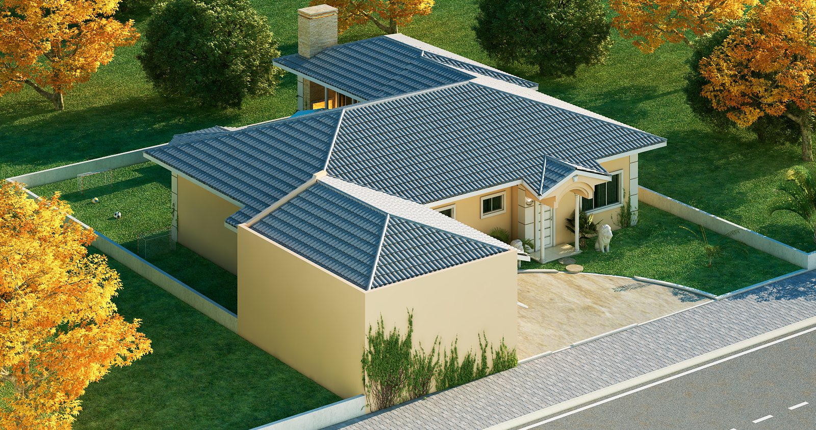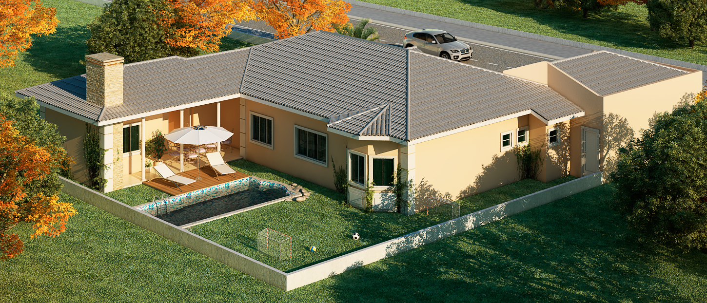 Área externa pensada para lazer e convivência Nos fundos, o projeto oferece uma área de lazer completa com piscina, deck de madeira, espreguiçadeiras e guarda-sol. O gramado conta com golzinho e bolas, ideal para brincadeiras em família. O muro baixo e o paisagismo com árvores de folhagem outonal criam um ambiente acolhedor e visualmente agradável. A presença de um cãozinho na entrada reforça o clima familiar e receptivo do projeto.