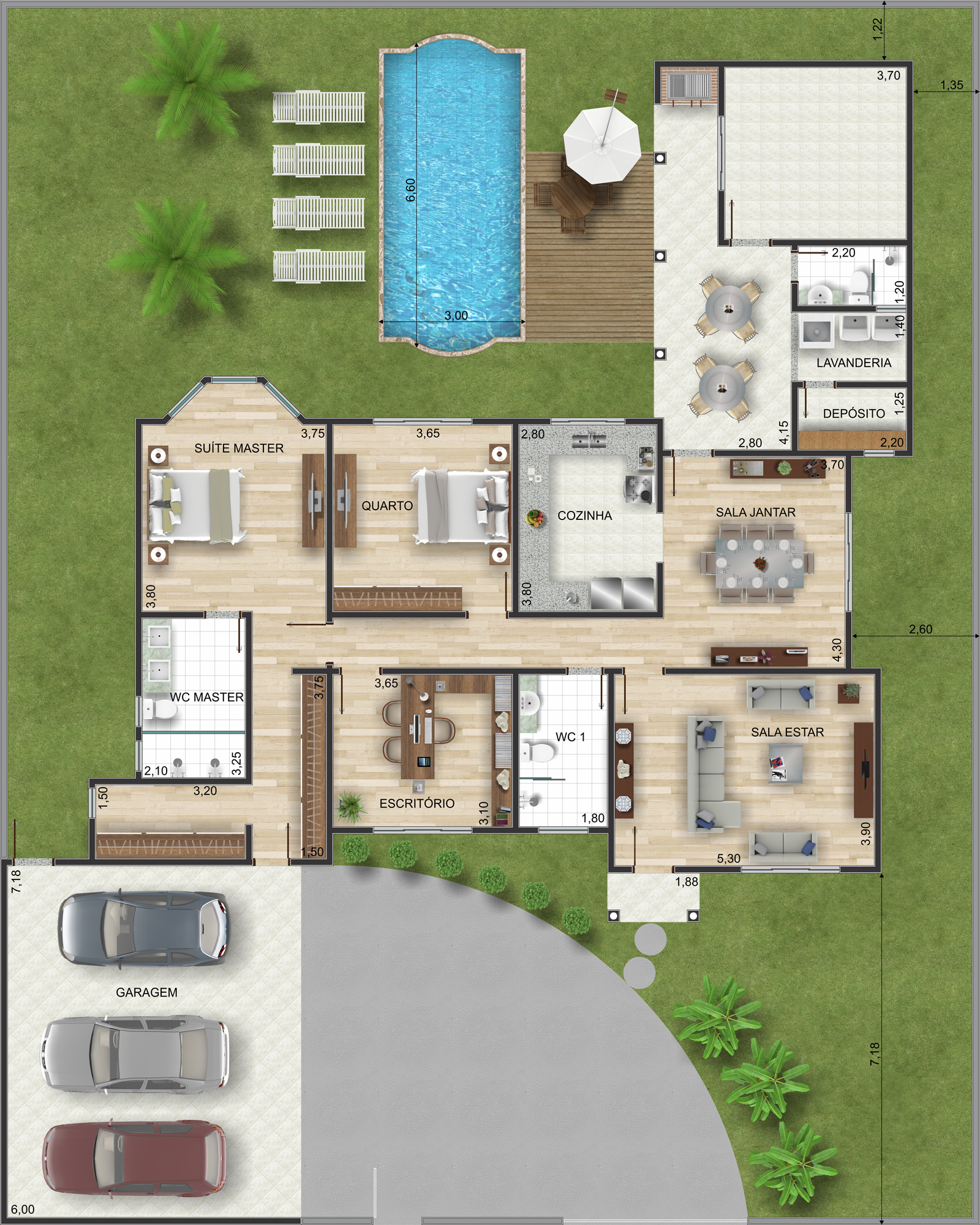 Ambientes internos bem distribuídos para o dia a dia A planta contempla três quartos, incluindo uma suíte master com banheiro privativo, além de um escritório que pode ser adaptado como quarto extra ou sala íntima. A sala de estar é ampla e integrada à sala de jantar, proporcionando fluidez entre os espaços. A cozinha funcional conecta-se à lavanderia e ao depósito, garantindo organização e praticidade. A garagem coberta comporta até três veículos, com acesso direto à área interna.