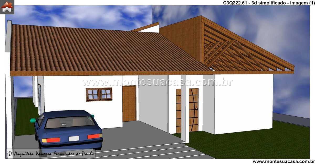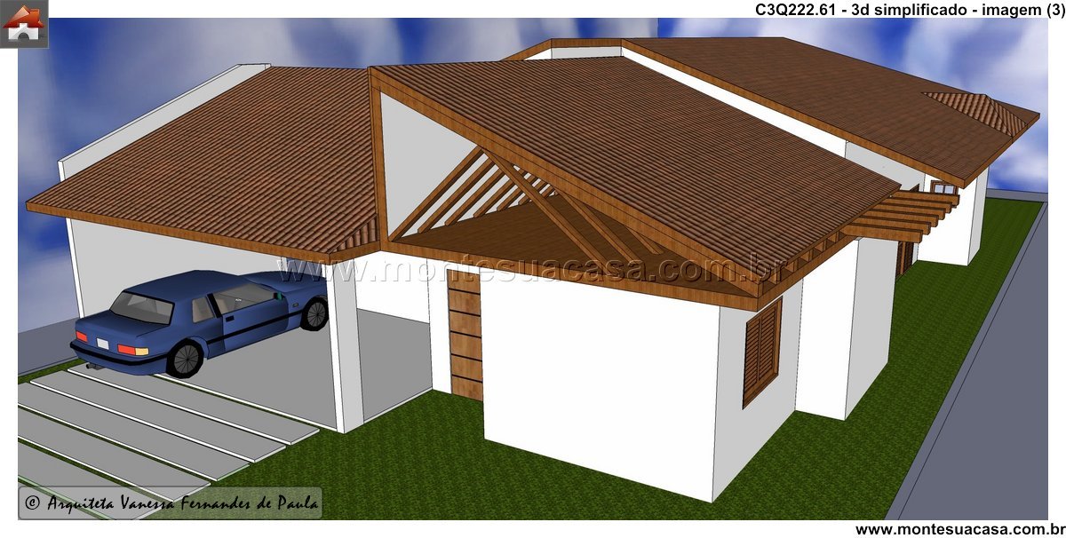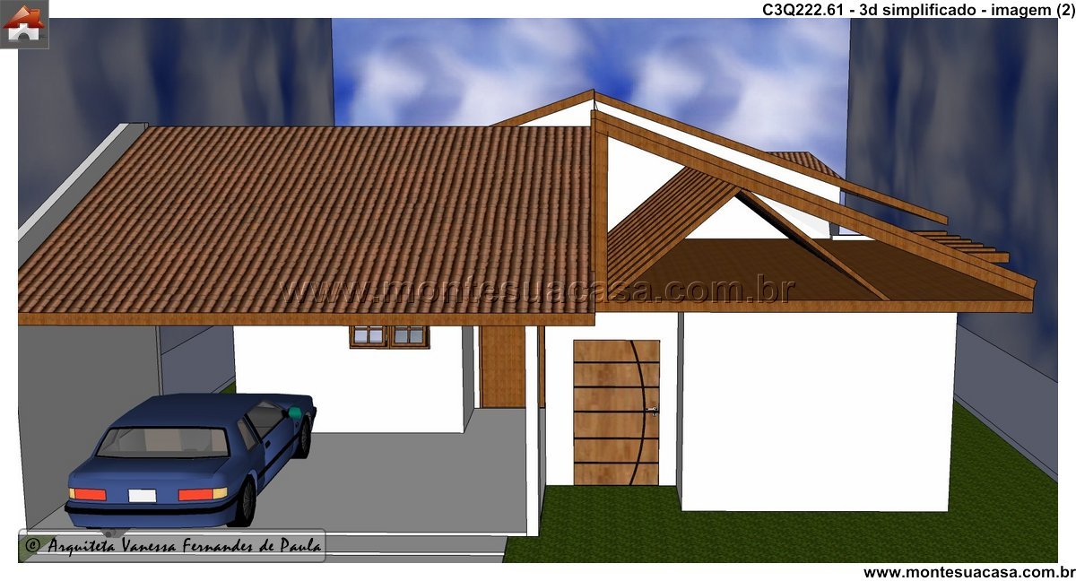 Detalhes que valorizam o projeto O uso de materiais naturais, como madeira e cerâmica, reforça o estilo contemporâneo com toque acolhedor. A cobertura com telhas cerâmicas e estrutura de madeira aparente confere personalidade à construção. O paisagismo frontal e lateral complementa a proposta, criando uma atmosfera agradável e convidativa.
