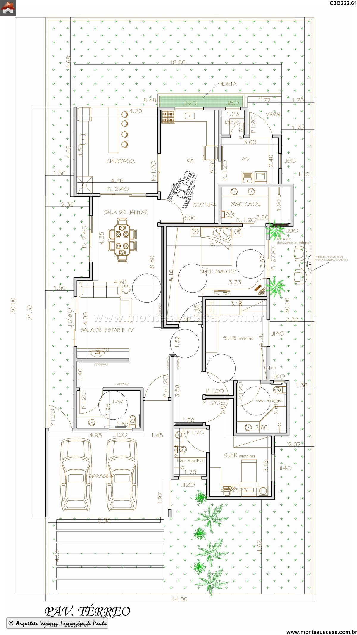 Suítes confortáveis e área íntima funcional A área íntima é composta por três suítes bem distribuídas: uma suíte master com closet e banheiro espaçoso, uma suíte para menina com banheiro privativo e uma terceira suíte reversível. Cada dormitório foi planejado para garantir privacidade e conforto, com ventilação cruzada e vista para áreas verdes. O projeto ainda contempla um banheiro social, despensa, lavanderia e horta nos fundos, promovendo sustentabilidade e praticidade.