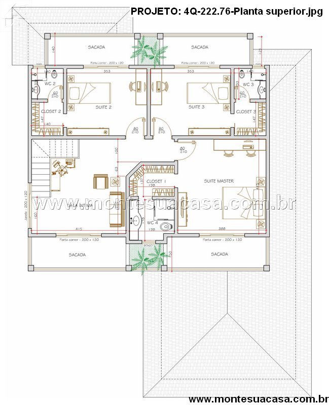 A escada leva a um ambiente íntimo que organiza o pavimento superior. As suítes 2 e 3 têm closets individuais e sacadas amplas com vista para o lazer. Ambas possuem banheiros completos e layouts funcionais para mobiliário.