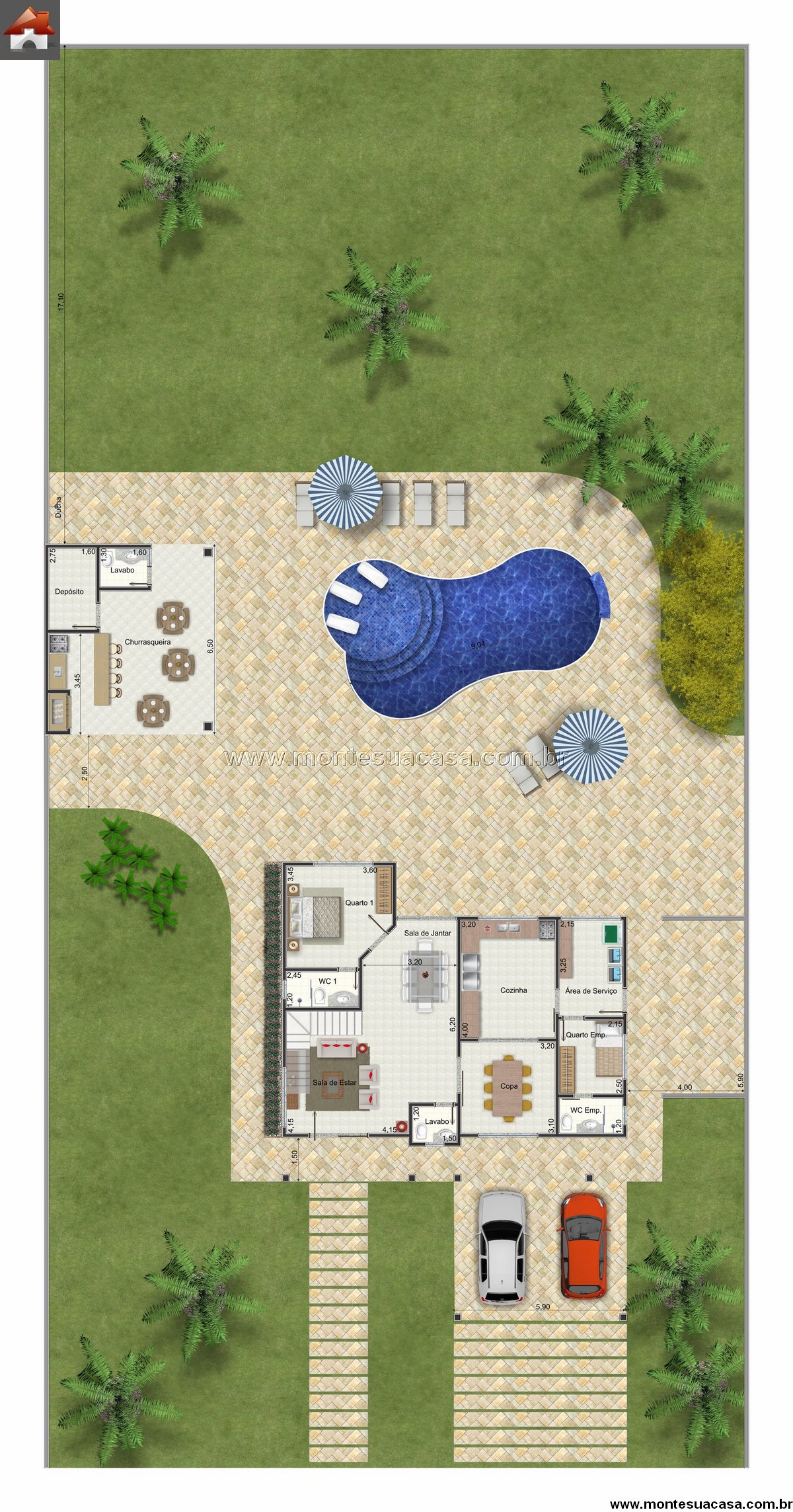 O destaque do terreno é o conjunto formado pela piscina de linhas orgânicas, o espaço gourmet fechado e a grande área pavimentada ao redor. A churrasqueira possui apoio, depósito e lavabo, permitindo uso independente da casa.