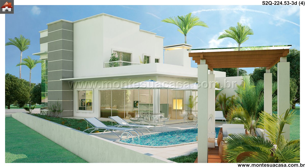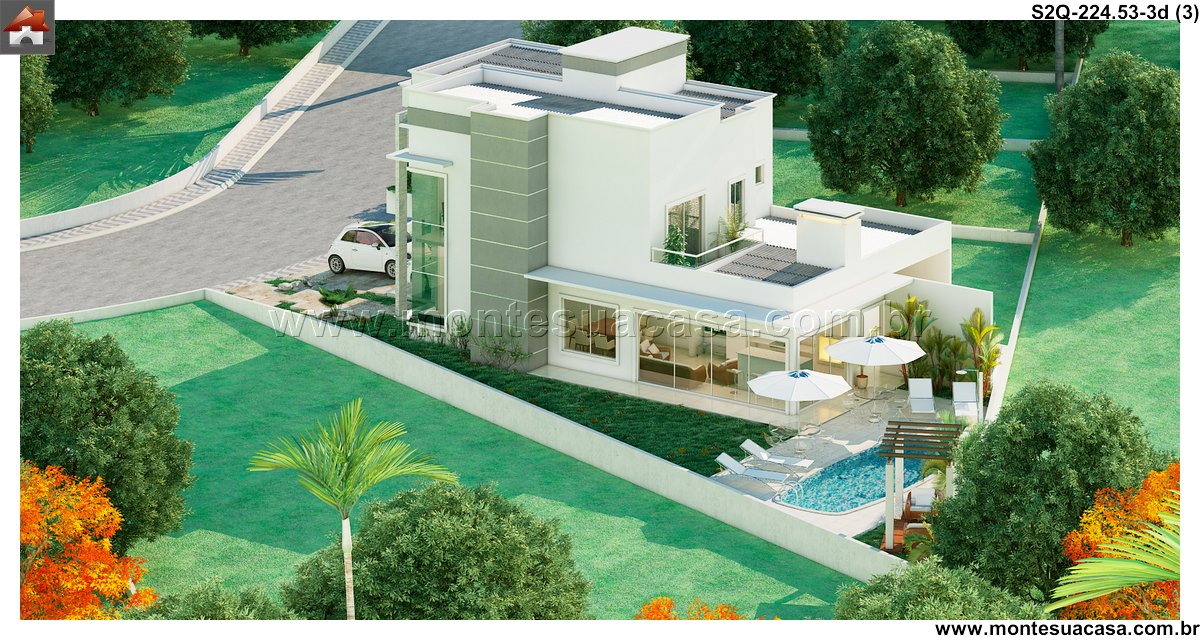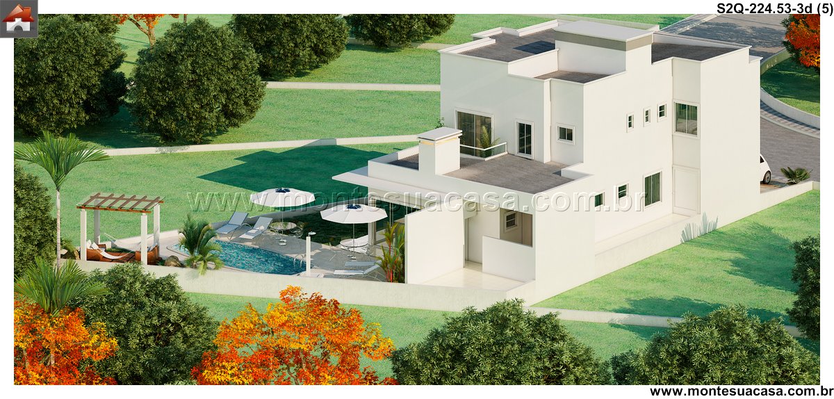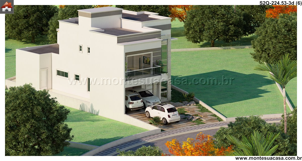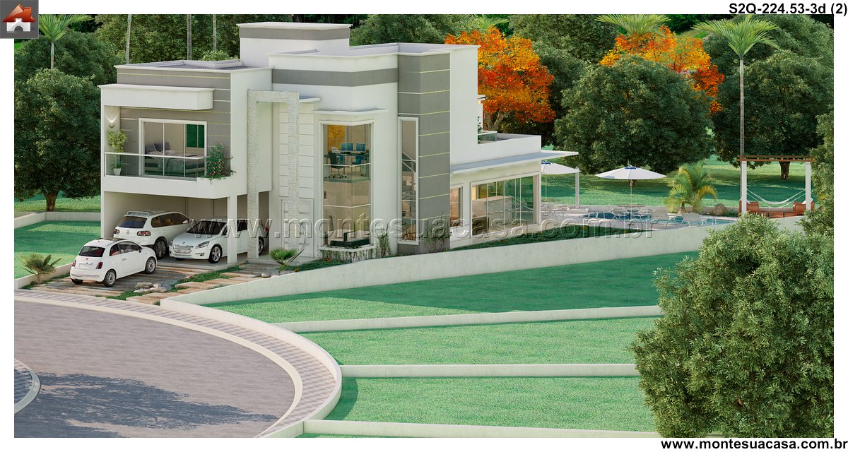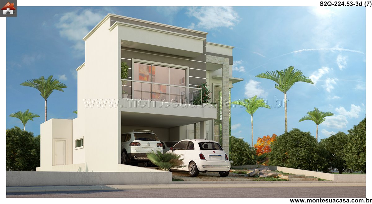 Este sobrado moderno de 224,53m² apresenta uma composição arquitetônica sólida, baseada em volumes bem definidos, grandes superfícies de vidro e uma fachada impactante que se destaca imediatamente. O conjunto frontal mostra pé-direito duplo, revestimentos lineares e um balanço elegante sobre a garagem, resultando em uma estética atual e bem estruturada.
