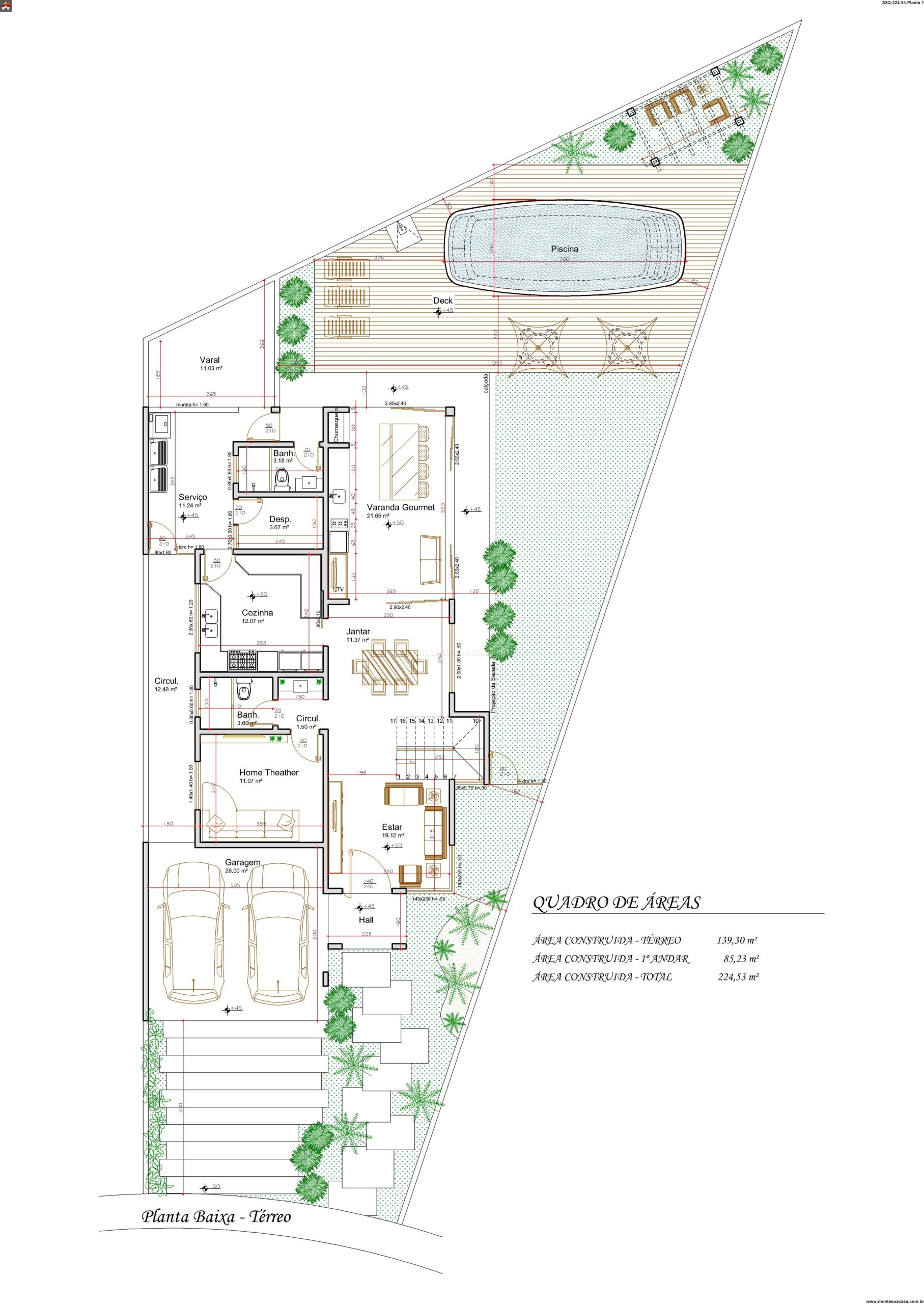 O sobrado se posiciona no lote considerando circulação, insolação e abertura dos ambientes principais para a área de lazer. A distribuição favorece ventilação, iluminação natural e integração visual entre interior e exterior.