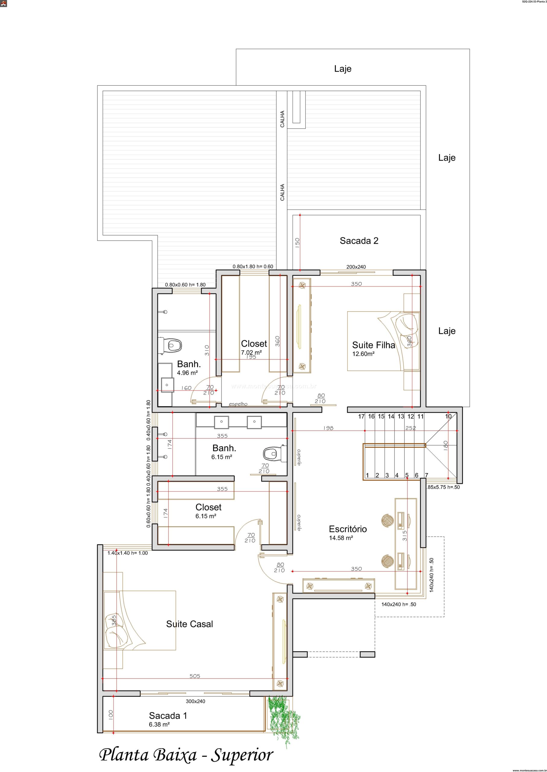 O andar superior abriga três suítes completas, distribuídas de forma eficiente para manter privacidade. A suíte master inclui closet espaçoso, banheiro confortável e sacada privativa. A suíte da filha também possui closet e abertura para uma sacada posterior, criando ventilação cruzada e excelente iluminação. A terceira suíte mantém autonomia total. Um escritório generoso complementa o pavimento, permitindo uso profissional ou estudo sem interferências.