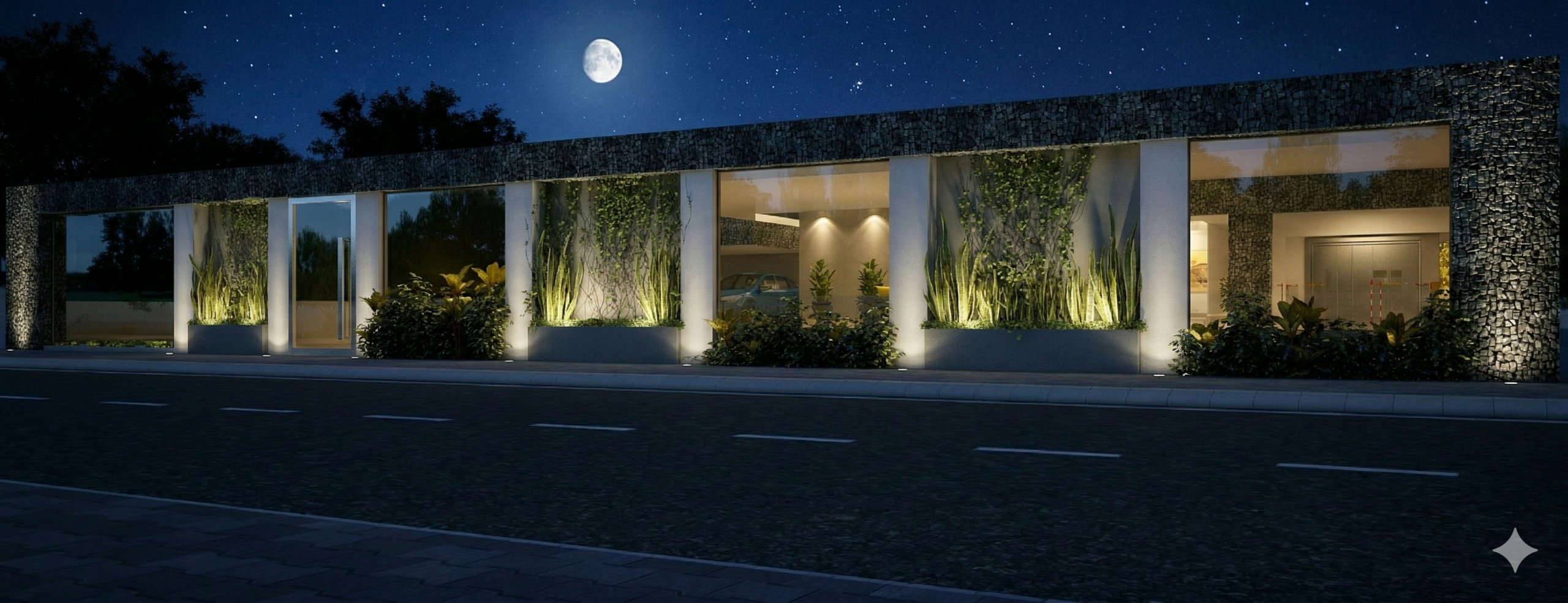 Infraestrutura funcional e completa Além da garagem para dois veículos, o projeto inclui área de serviço, despensa, quarto de serviço e banheiro auxiliar. Esses espaços foram pensados para facilitar o dia a dia sem comprometer a estética do projeto. A circulação entre os ambientes é fluida, com destaque para o uso inteligente de materiais e acabamentos modernos.