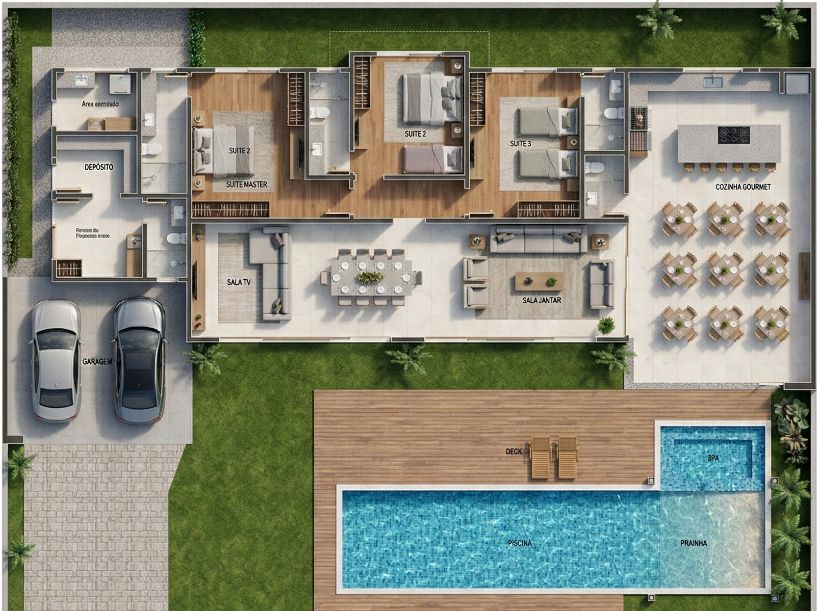 Ambientes sociais integrados A área social é composta por sala de estar, sala de jantar e sala de TV, todas interligadas para promover convivência e fluidez. O destaque fica por conta do espaço gourmet, estrategicamente posicionado ao lado da piscina coberta e do deck, criando um ambiente ideal para receber amigos e familiares com estilo e praticidade.