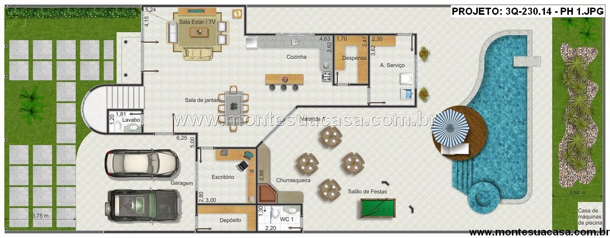 O salão de festas com churrasqueira e mesa de sinuca transforma qualquer ocasião em celebração. A piscina com spa circular e deck de madeira oferece um ambiente perfeito para relaxar. A casa de máquinas da piscina (2,64m de largura) facilita a manutenção.