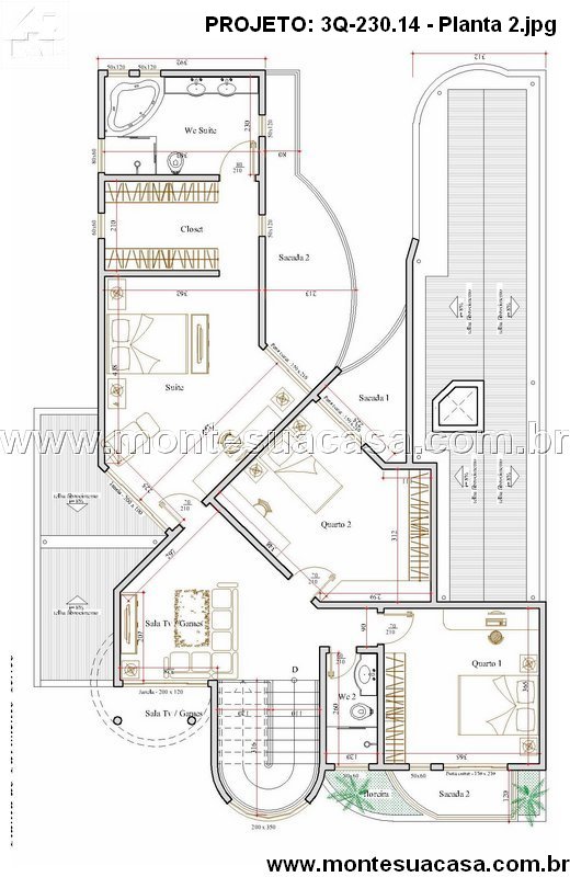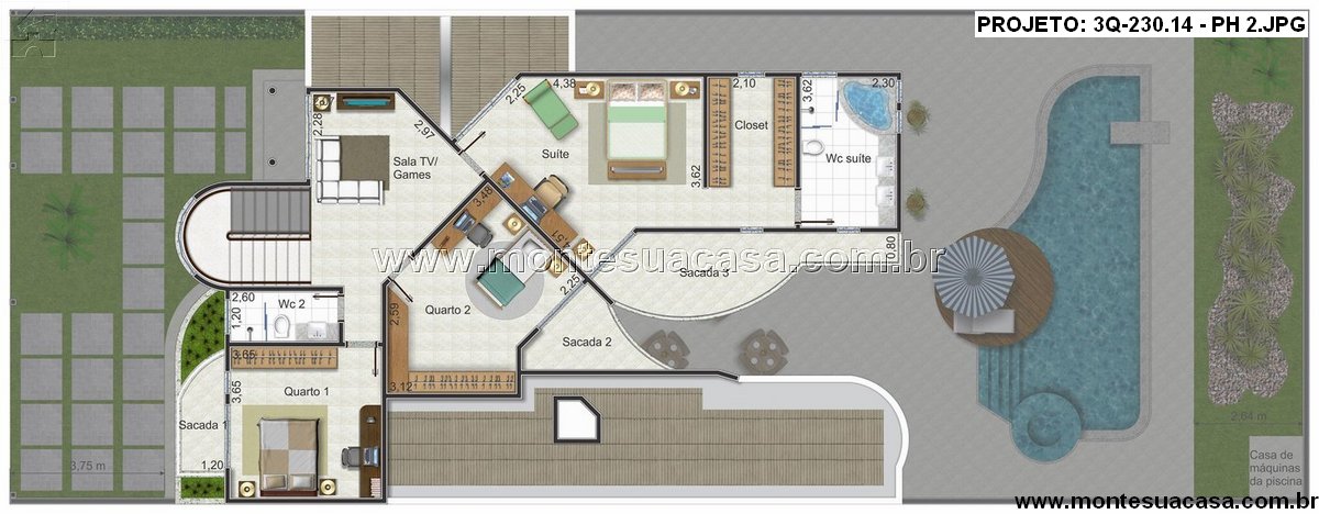 A suíte principal possui closet e banheiro com banheira. Dois quartos adicionais e um banheiro compartilhado atendem às necessidades da família. A sala de TV/Games e duas sacadas ampliam as opções de convivência.