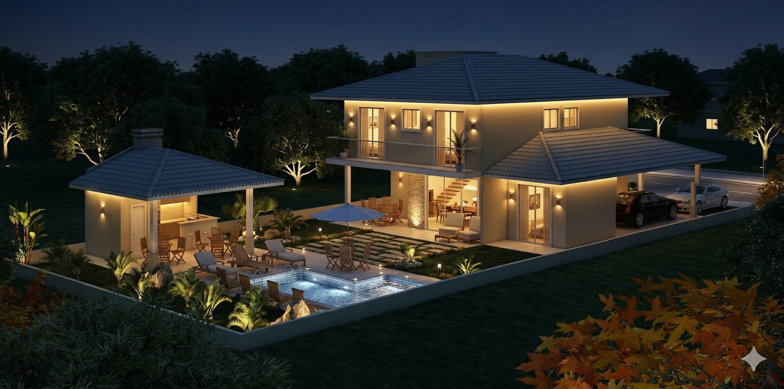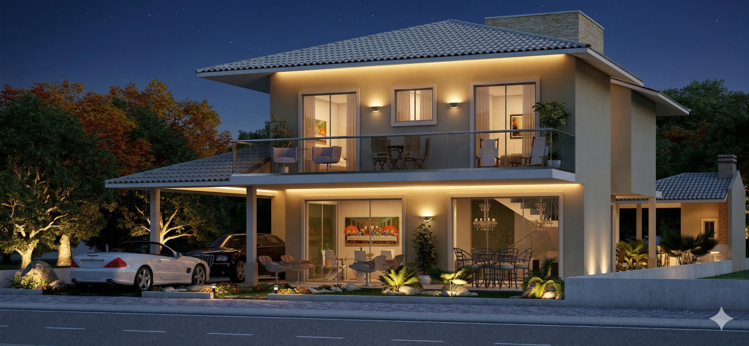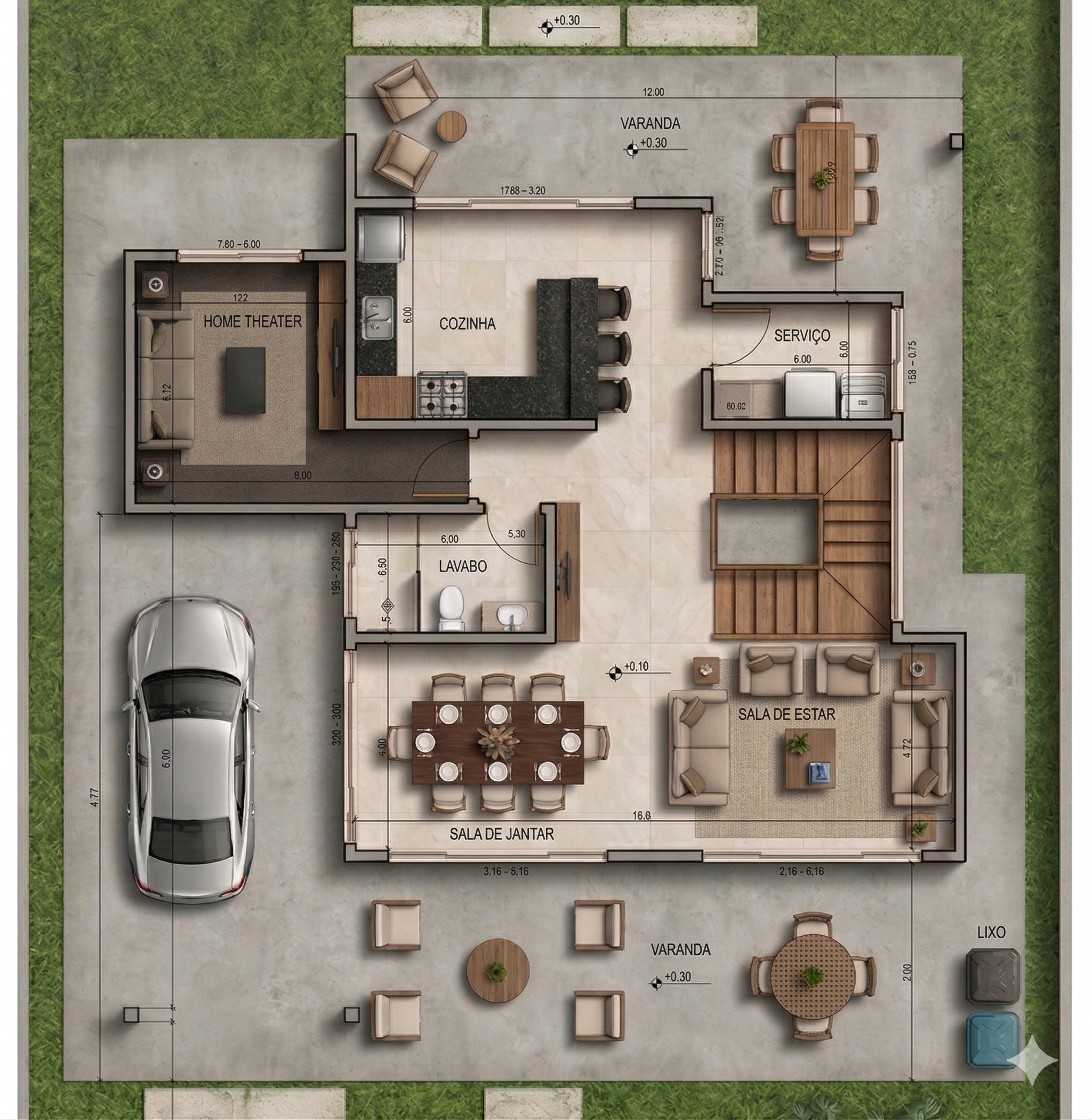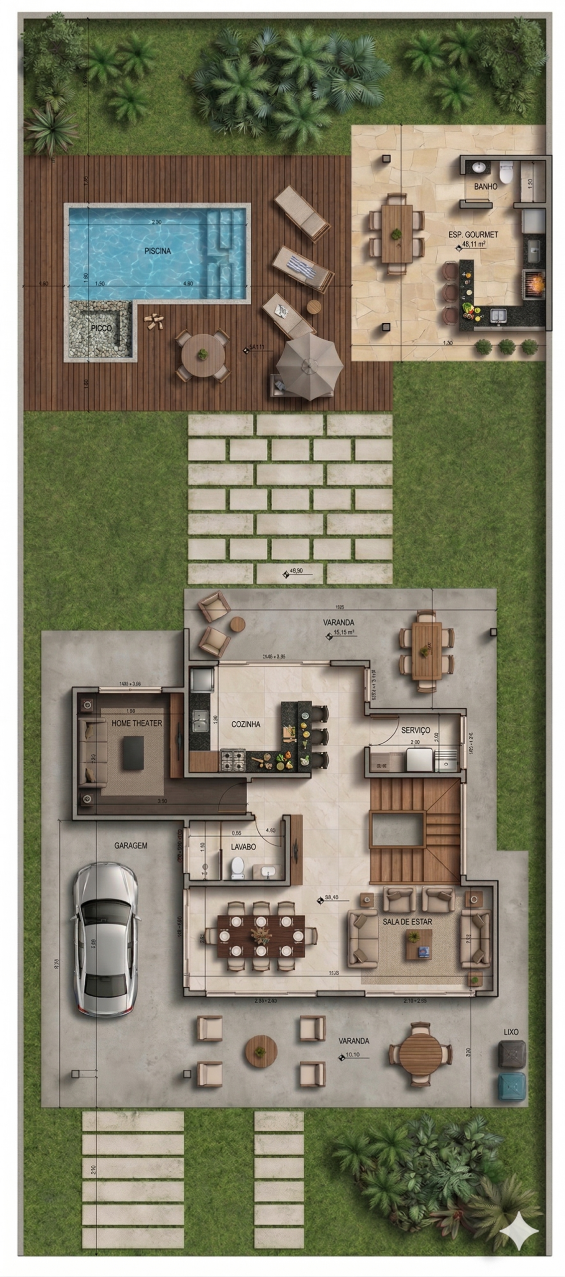 O sobrado se desenvolve em dois pavimentos, organizando os ambientes de forma estratégica. A área social no pavimento térreo cria uma sensação de amplitude, conectando a varanda à sala de estar e ao home theater. Esta integração é perfeita para receber amigos e familiares, promovendo convívio e entretenimento. A cozinha, integrada à área gourmet, facilita o serviço e se torna o coração da casa, ideal para refeições informais. Um quarto de serviço completo garante a funcionalidade do dia a dia.