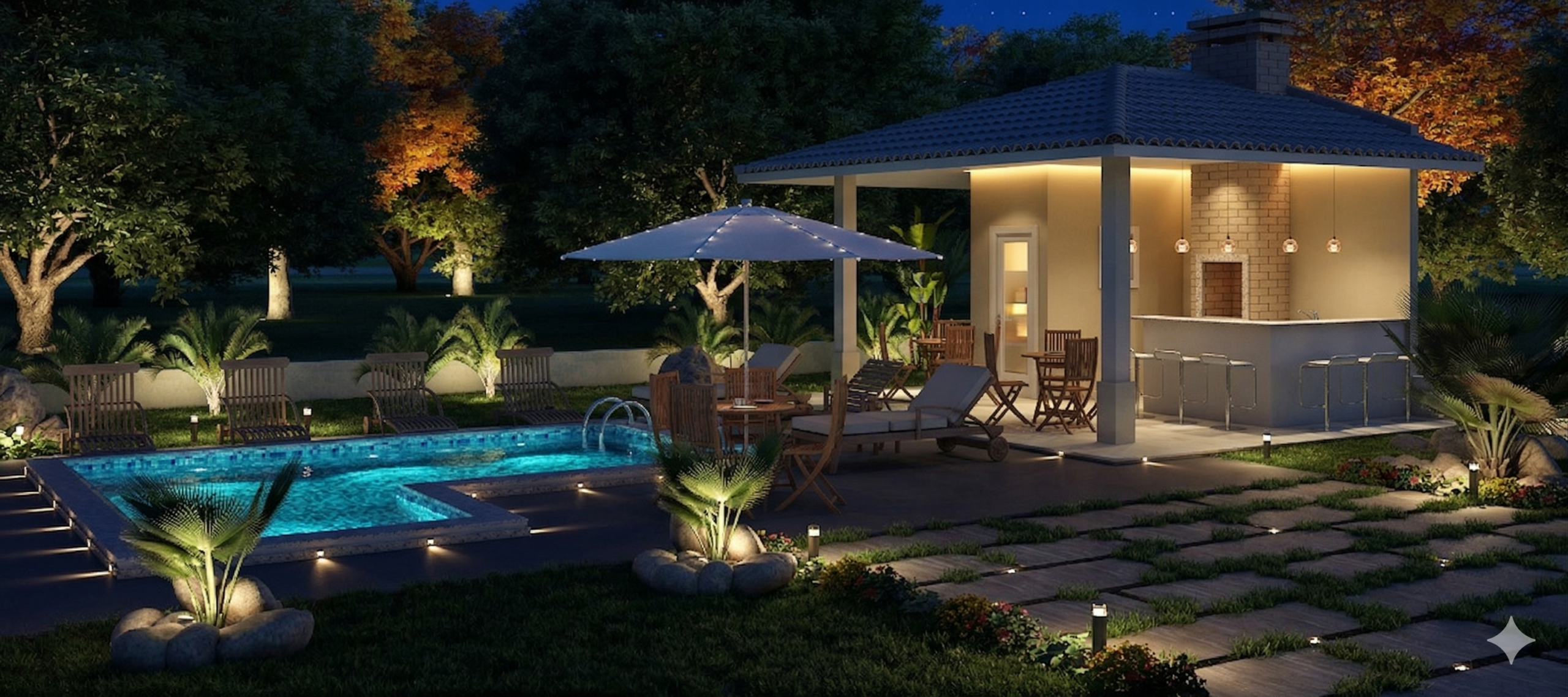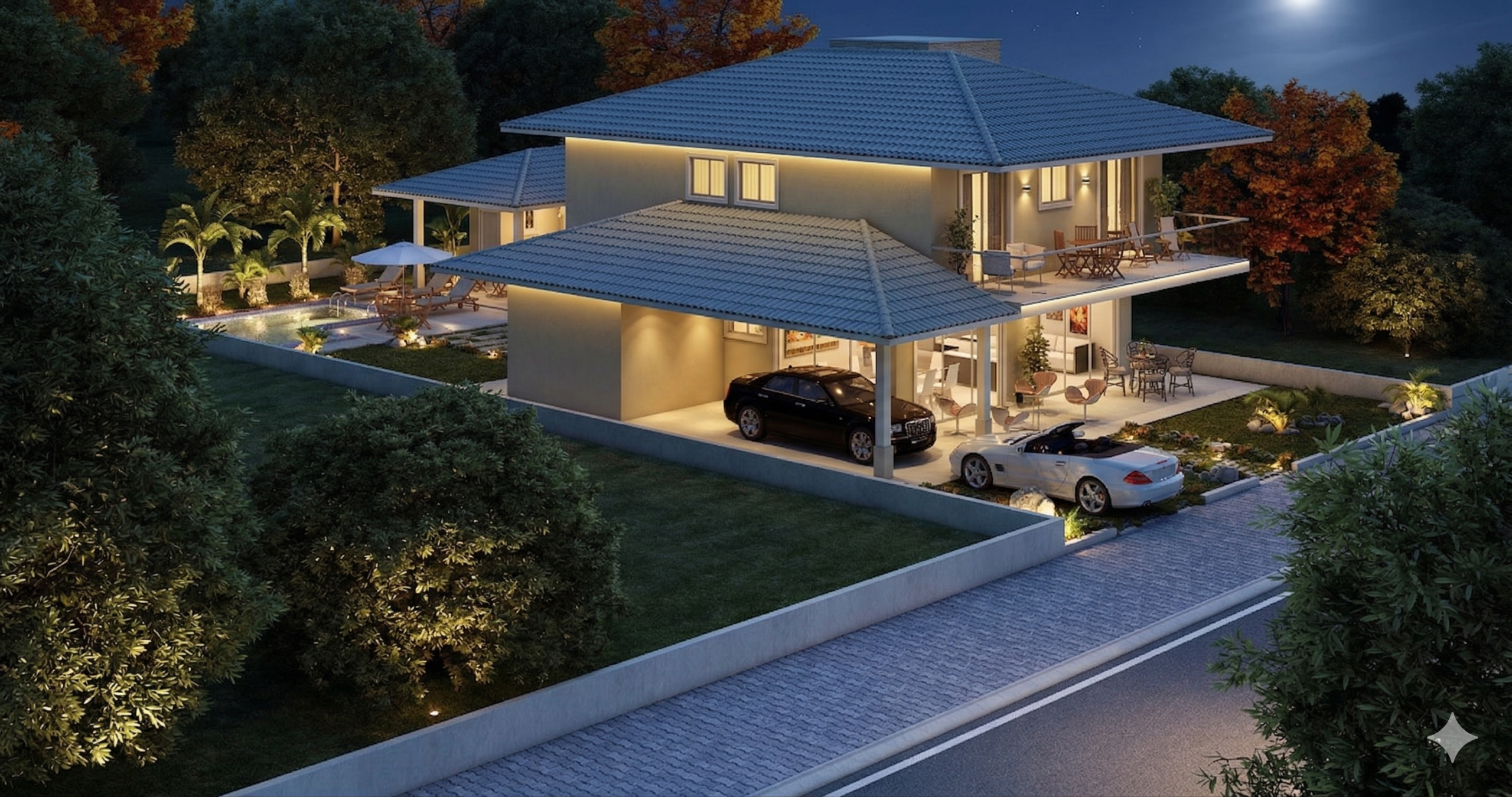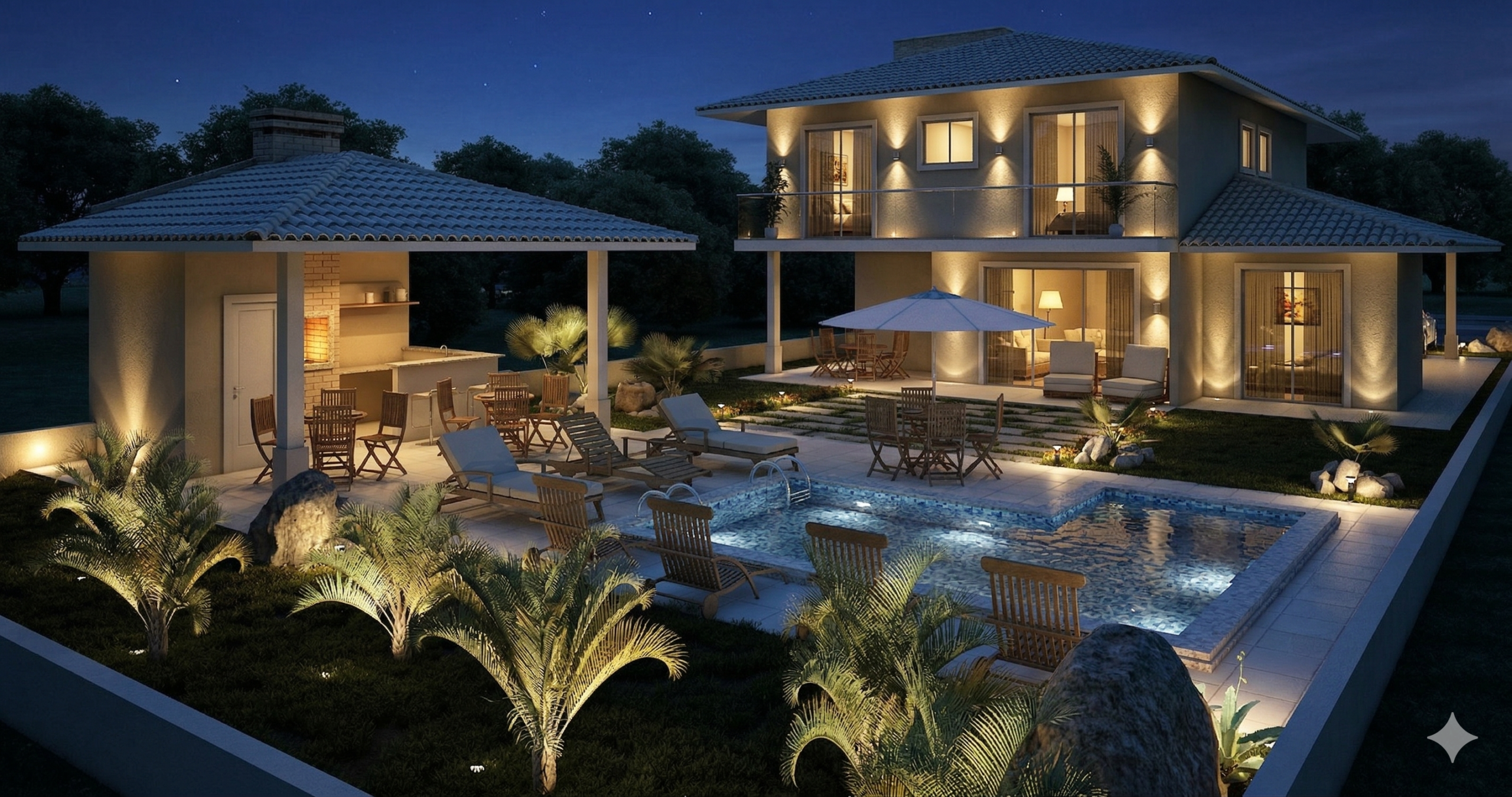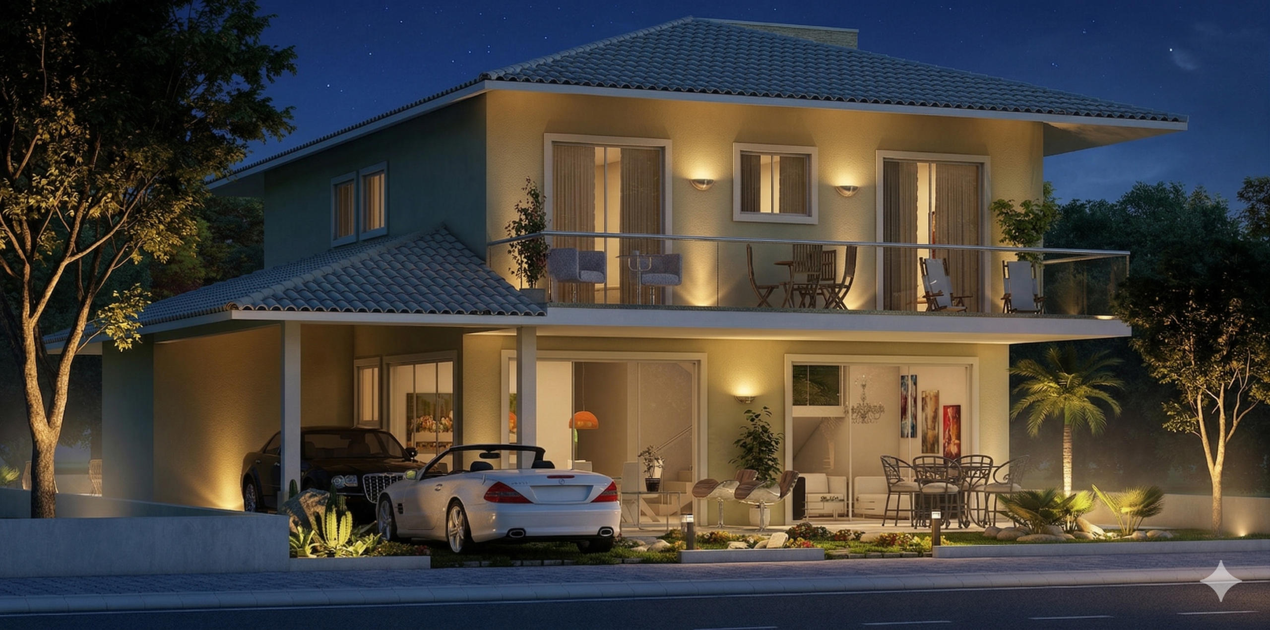 O sobrado se desenvolve em dois pavimentos, organizando os ambientes de forma estratégica. A área social no pavimento térreo cria uma sensação de amplitude, conectando a varanda à sala de estar e ao home theater. Esta integração é perfeita para receber amigos e familiares, promovendo convívio e entretenimento. A cozinha, integrada à área gourmet, facilita o serviço e se torna o coração da casa, ideal para refeições informais. Um quarto de serviço completo garante a funcionalidade do dia a dia.