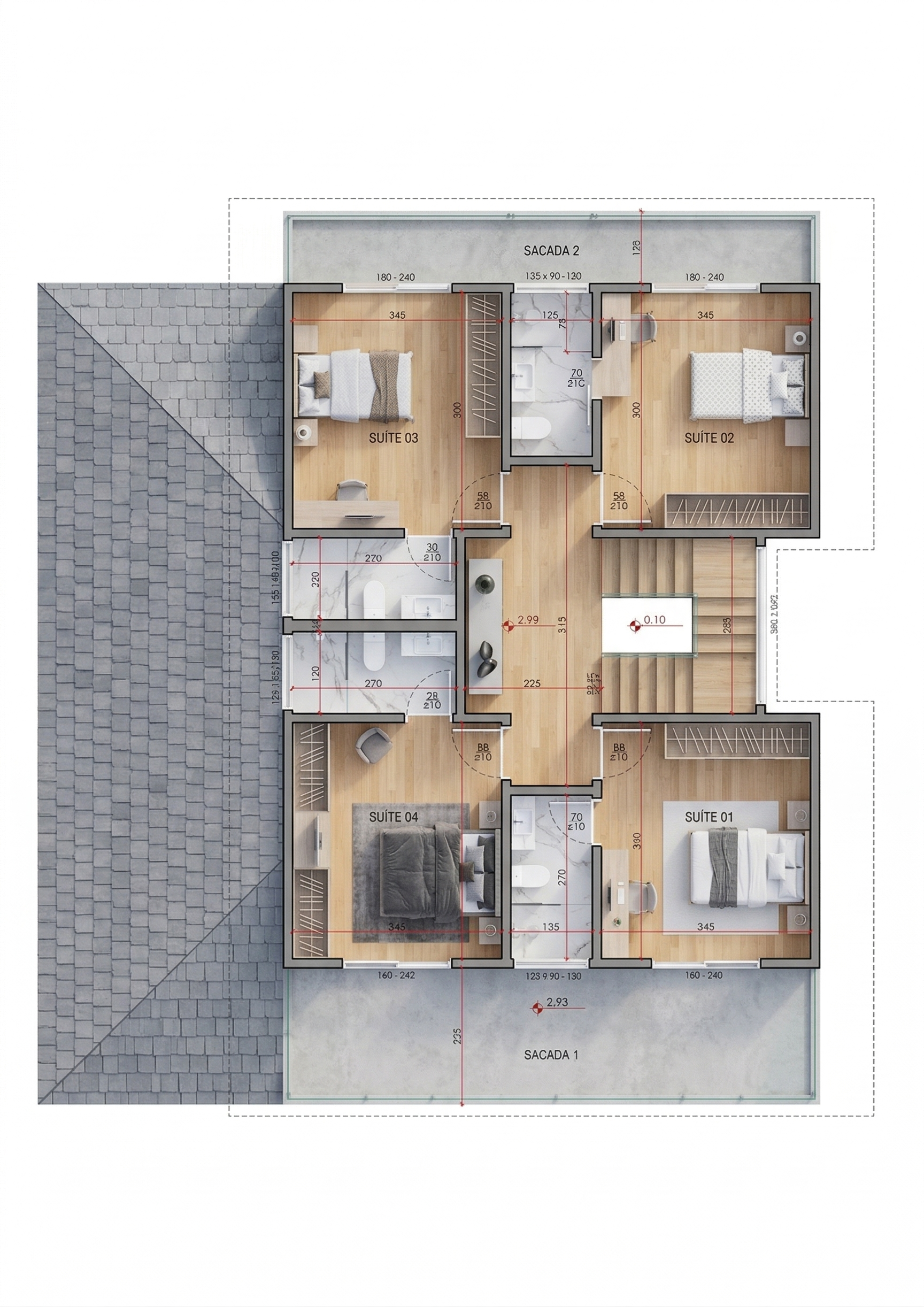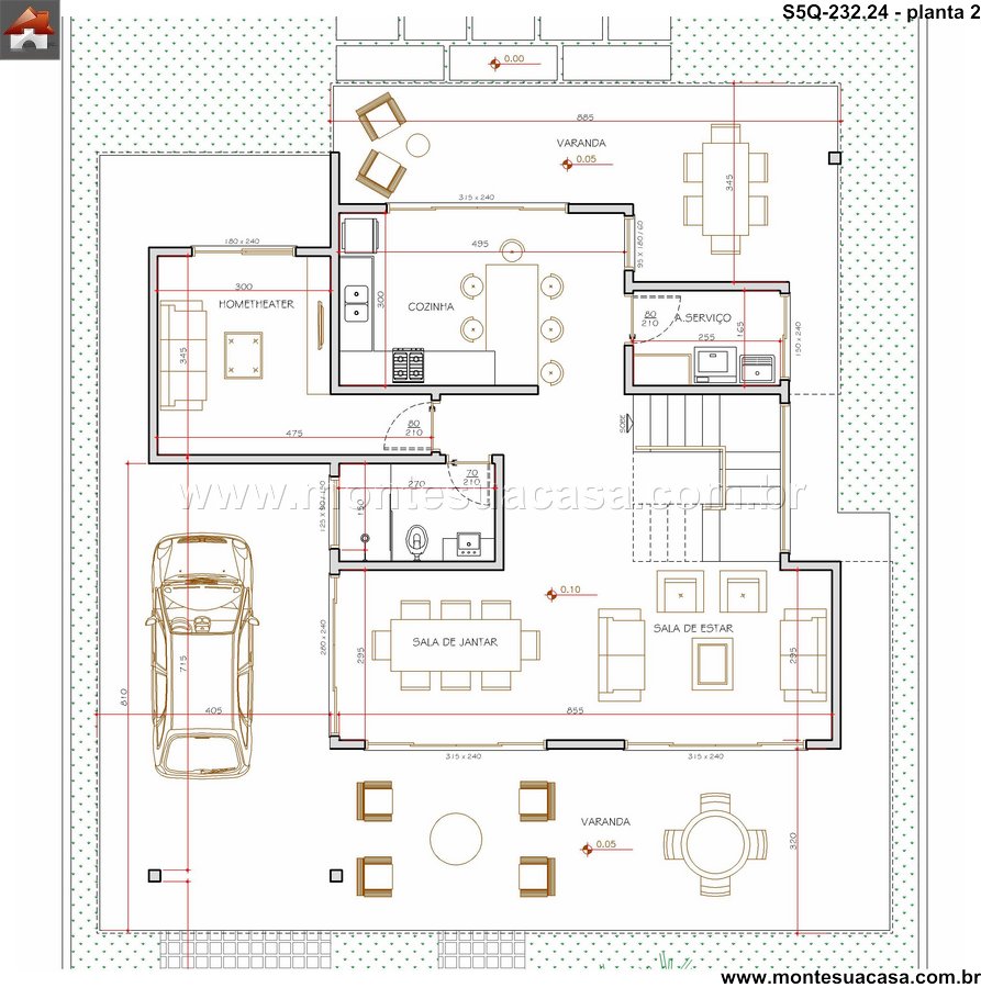 No pavimento superior, a privacidade dos dormitórios é preservada. O projeto inclui cinco quartos, sendo uma suíte master espaçosa com closet. Os demais quartos compartilham um banheiro bem distribuído, atendendo perfeitamente às necessidades de filhos ou hóspedes. O home theater dedicado no térreo oferece um espaço de lazer imersivo para a família. A varanda anexa à sala proporciona um local para relaxar e aproveitar momentos de descontração.