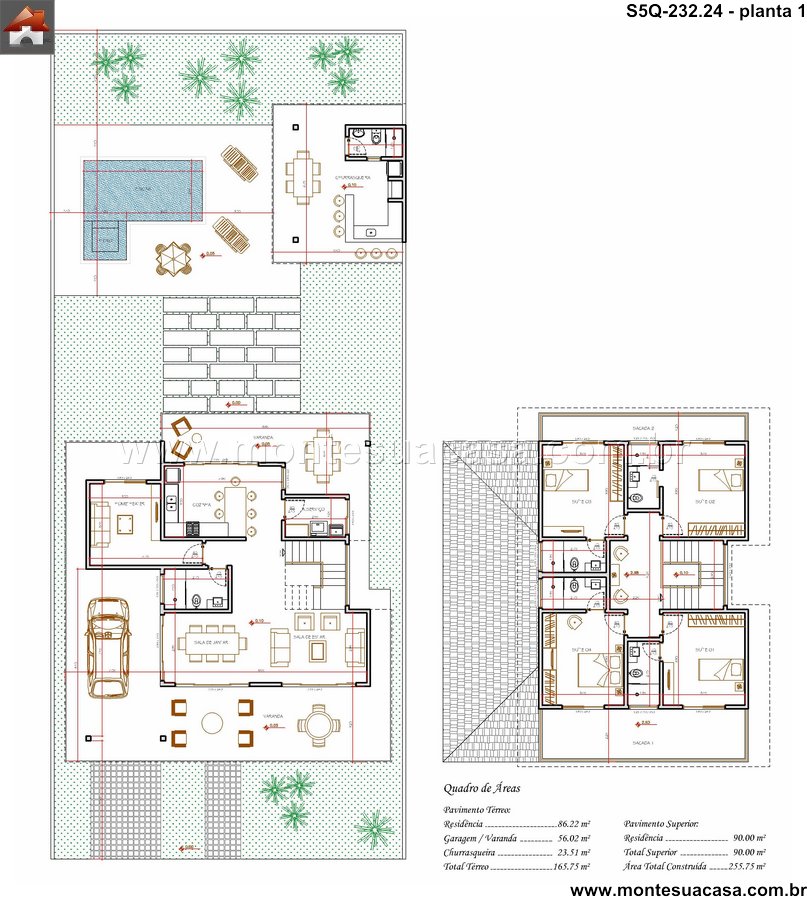 Este projeto de arquitetura apresenta um sobrado moderno e funcional, com 232.24m² de área construída. A planta foi meticulosamente planejada para oferecer conforto e praticidade para a família, distribuindo cinco quartos em um layout que valoriza os espaços integrados e a iluminação natural. A fachada dialoga com as linhas contemporâneas, enquanto os ambientes internos priorizam a circulação fluida e a multifuncionalidade.