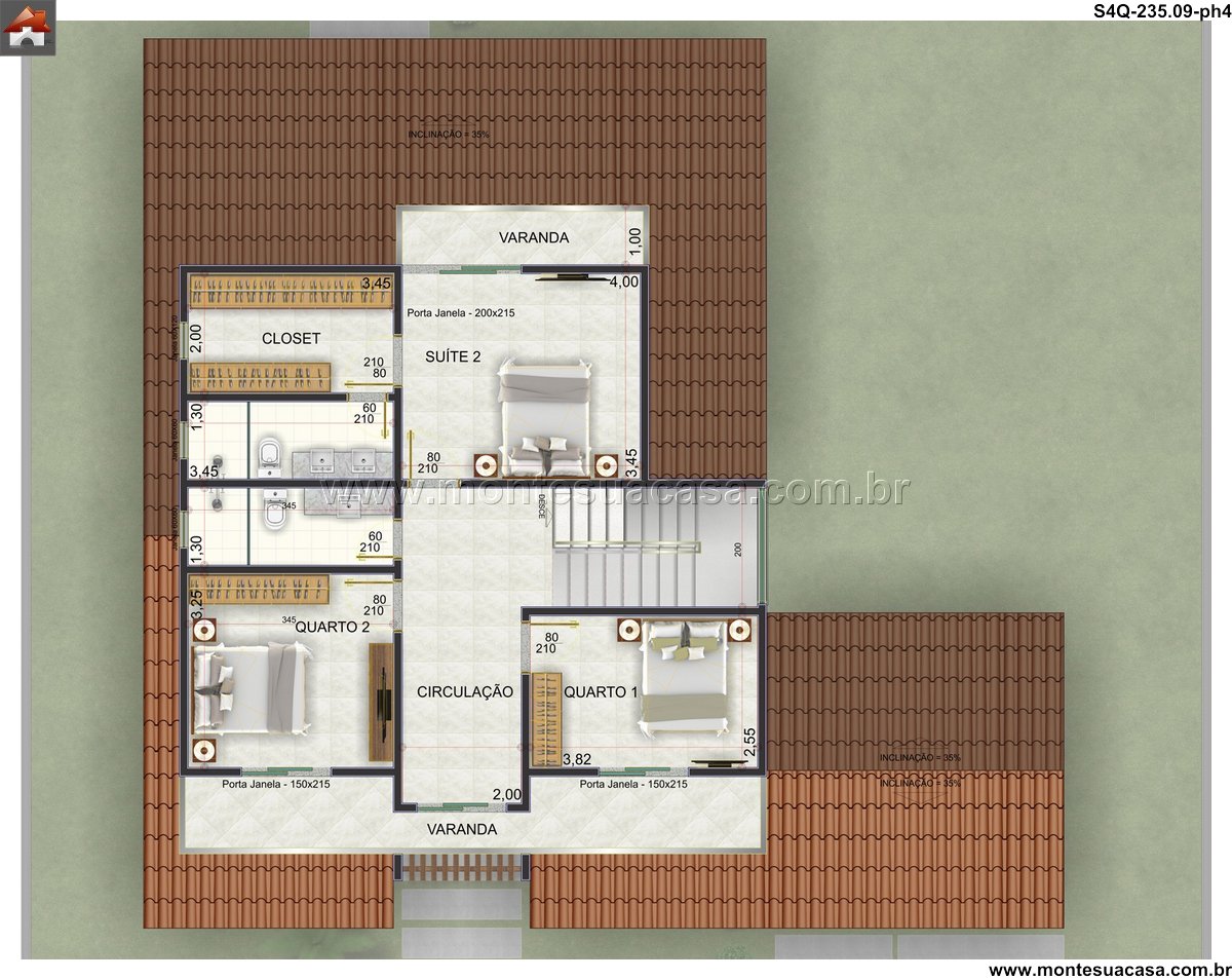 O pavimento superior é dedicado ao descanso e à vida privada, abrigando quatro quartos bem dimensionados. As duas suítes oferecem banheiros privativos e espaço amplo, com a suíte 1 aproveitando uma ligação direta com o escritório, criando uma suíte office perfeita para profissionais que trabalham em home office. Os demais quartos compartilham um banheiro social, sendo todos iluminados e ventilados naturalmente. Esta configuração garante o equilíbrio ideal entre a agitação das áreas comuns e a serenidade dos espaços de repouso.