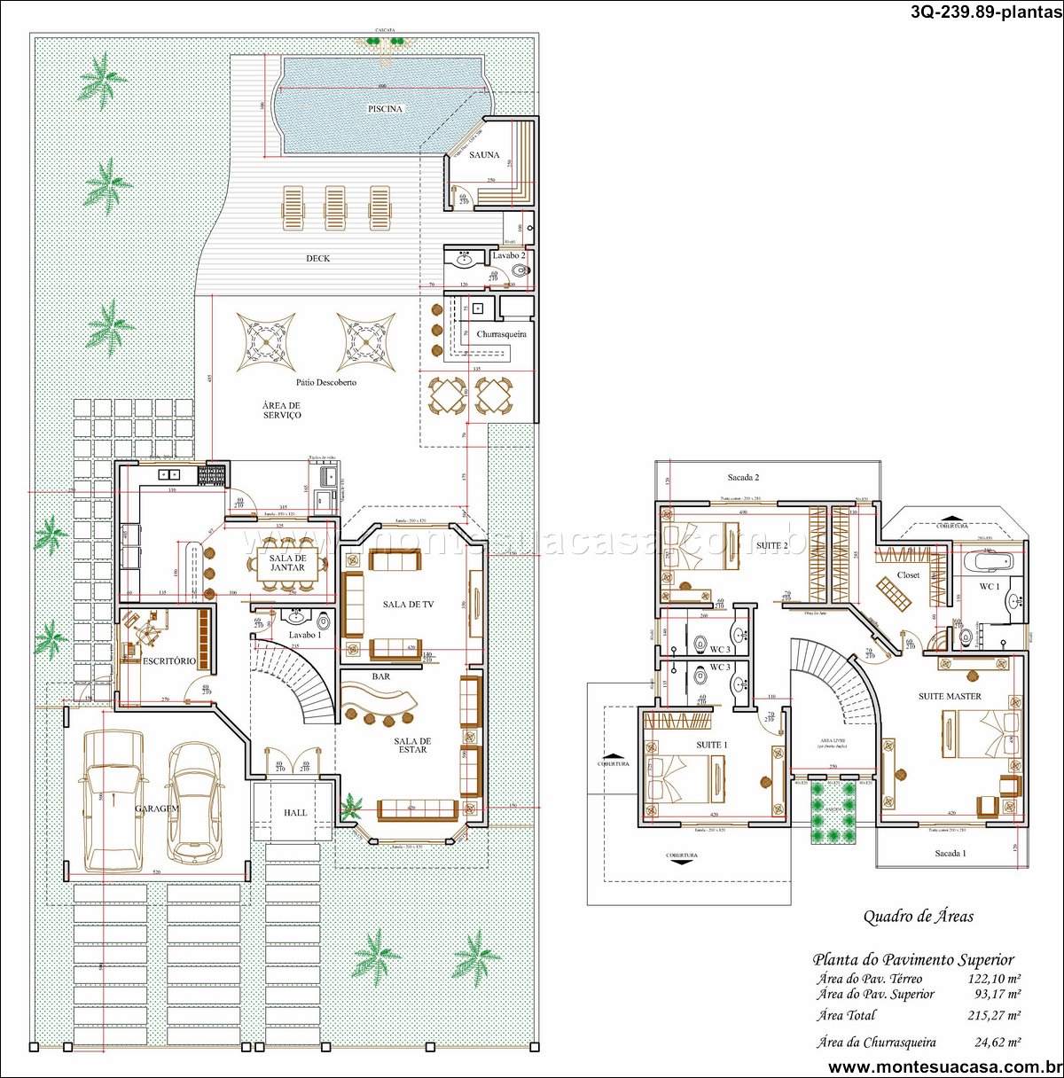 Ambientes sociais conectados e área de lazer completa No pavimento térreo, os espaços sociais são integrados para promover convivência e funcionalidade. A sala de estar, sala de jantar e sala de TV formam um ambiente acolhedor e fluido. A cozinha se conecta à área gourmet com churrasqueira, ideal para momentos de confraternização. O deck em madeira e a piscina com borda curva oferecem um espaço externo relaxante, complementado por sauna, pátio descoberto e lavabo. O escritório e a garagem coberta para dois carros completam o térreo com praticidade.