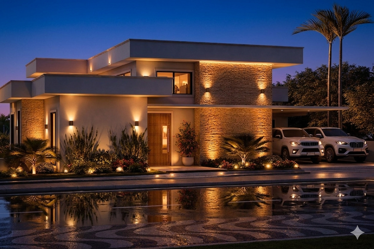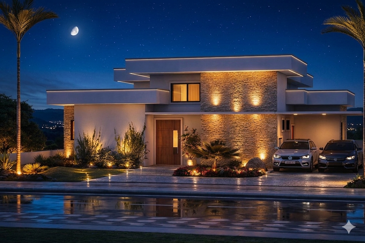 Fachada moderna e acolhedora A fachada apresenta linhas retas e volumes bem definidos, com acabamento em pintura branca e detalhes em pedra natural. Grandes aberturas em vidro proporcionam iluminação abundante e conexão visual com o jardim. O paisagismo com palmeiras e arbustos valoriza ainda mais a estética do imóvel.
