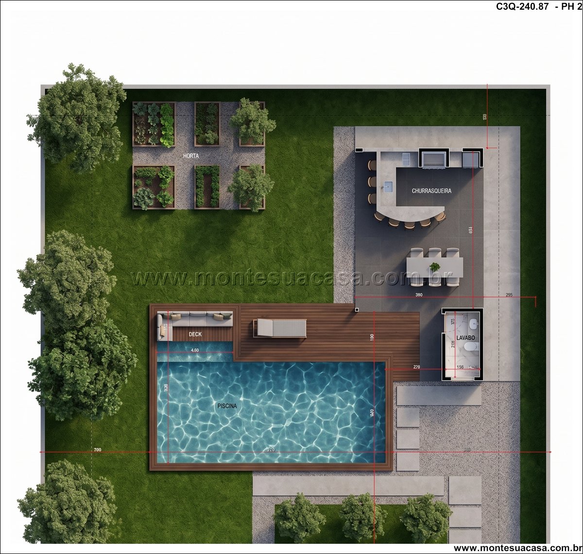 Área externa com lazer completo A piscina em formato L é o destaque da área de lazer, cercada por um jardim exuberante e um deck com espreguiçadeiras. Ao lado, o espaço gourmet coberto conta com churrasqueira, mesa de jantar e área de convivência, ideal para encontros com amigos e familiares.
