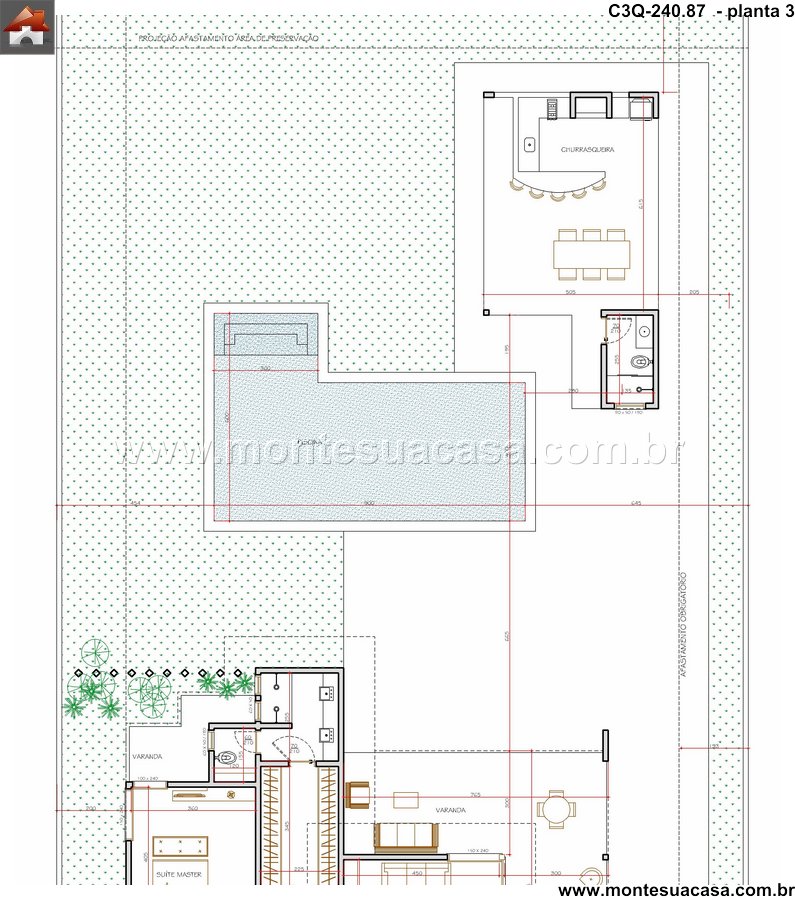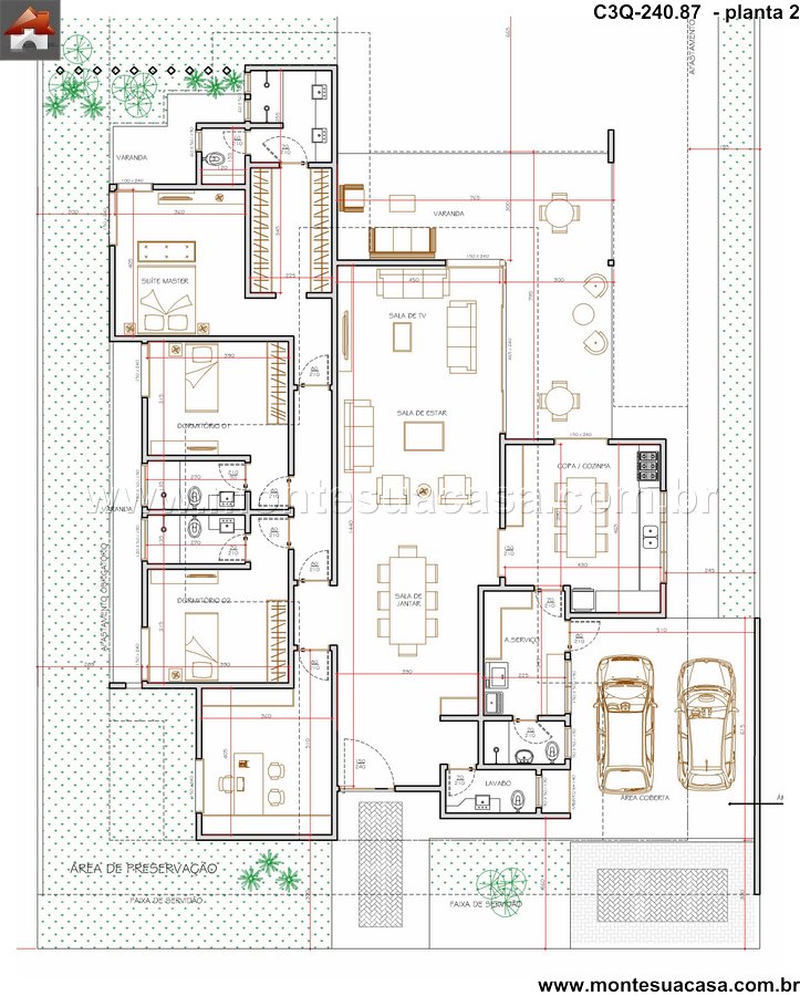 Varandas e integração com o verde A varanda frontal e lateral proporcionam sombra e ventilação natural, além de reforçar a conexão com o paisagismo. O projeto respeita áreas de preservação e inclui faixa de serviço e faixa de entrada com calçamento decorativo.