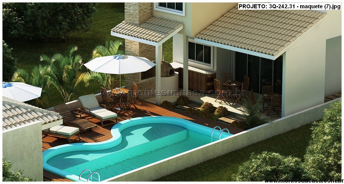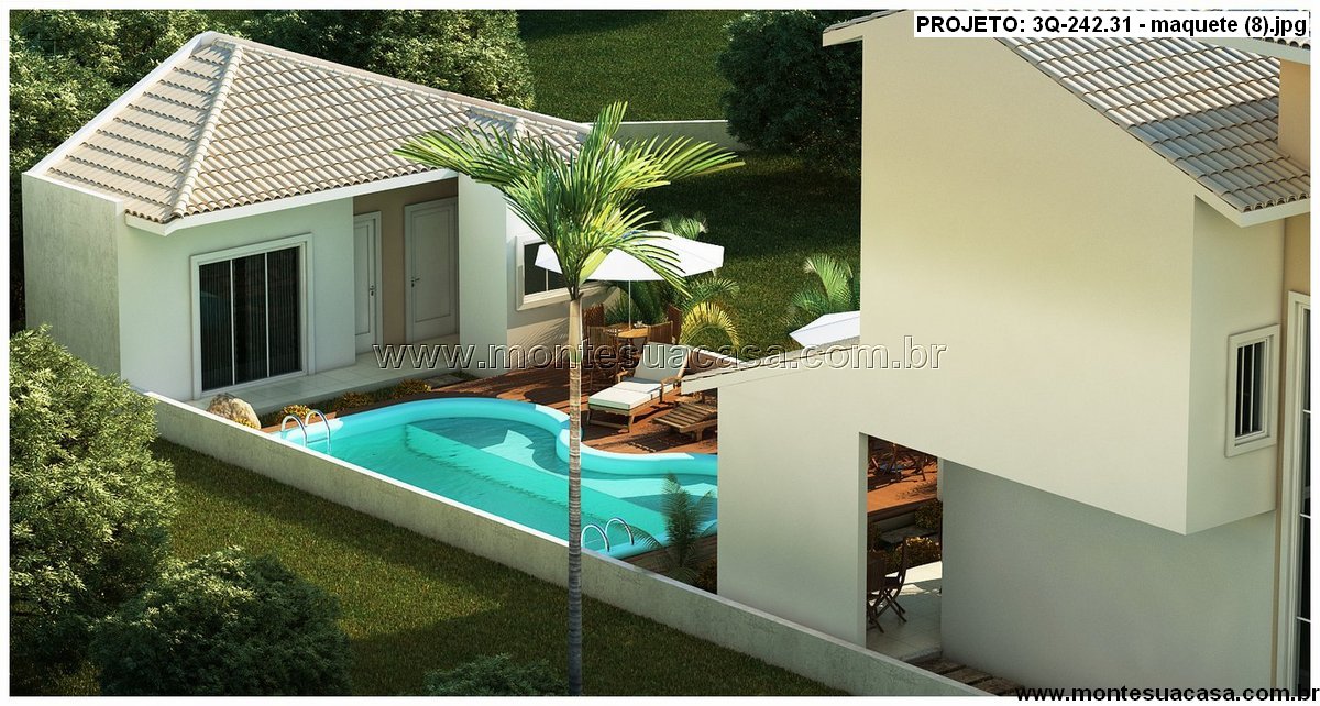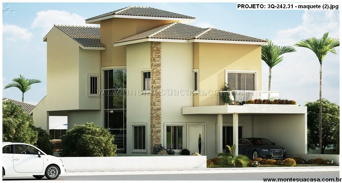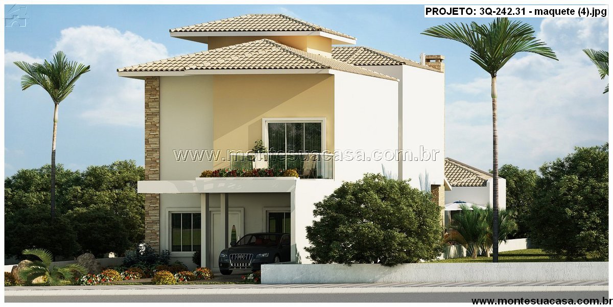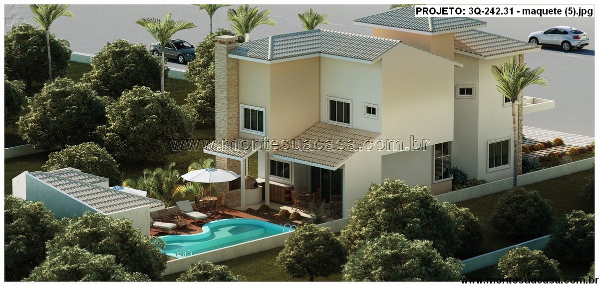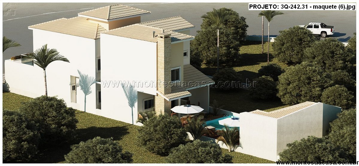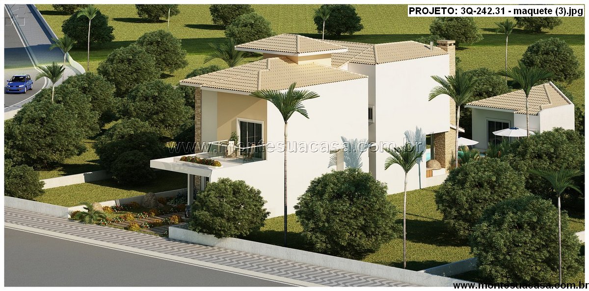 O paisagismo valoriza o entorno com palmeiras, gramado e arbustos, criando uma atmosfera acolhedora e tropical. A residência se adapta perfeitamente a terrenos urbanos e oferece excelente aproveitamento de espaço, com foco em funcionalidade e estilo.
