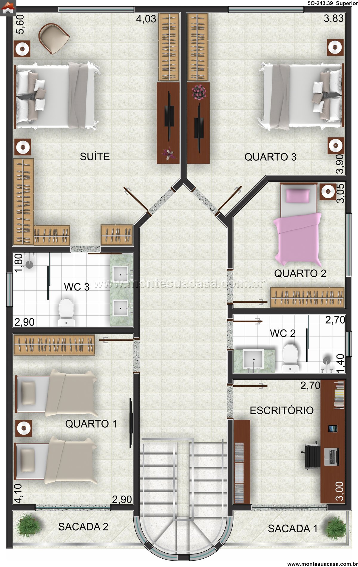 O pavimento superior, com 101.21 m², é dedicado ao descanso e à privacidade. Ele abriga cinco quartos, garantindo espaço para todos. A suíte master oferece um refúgio privativo, enquanto os outros quartos compartilham banheiros bem distribuídos. Um escritório no andar superior proporciona um ambiente silencioso para trabalho ou estudos, assegurando produtividade sem sair de casa.