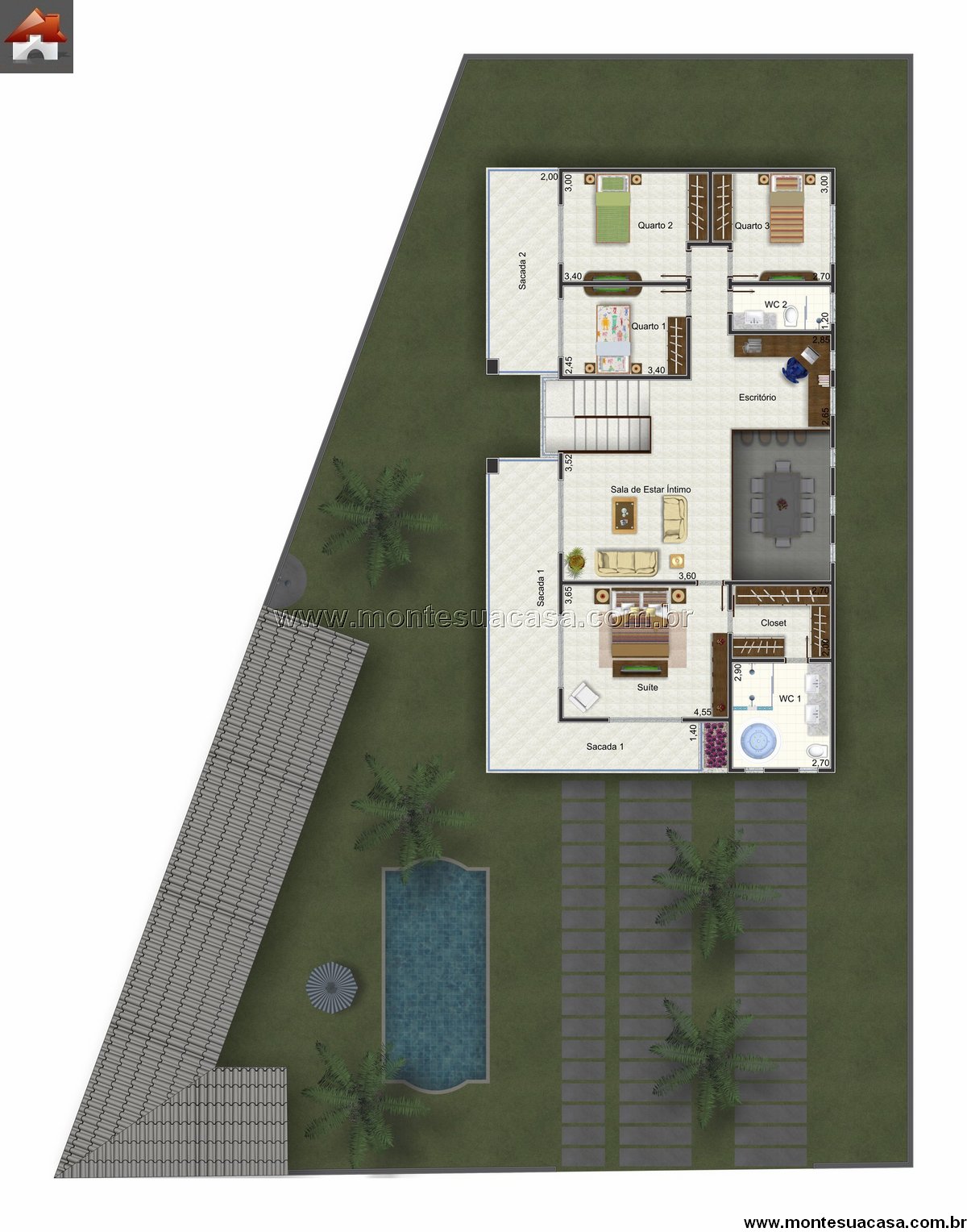 O pavimento superior distribui quatro dormitórios, sendo três quartos amplos e uma suíte master completa, equipada com closet, banheiro espaçoso e sacada privativa. A sala de estar íntimo organiza a circulação, oferecendo um ambiente reservado para convivência familiar. O escritório posicionado próximo aos dormitórios atende perfeitamente quem trabalha em home office ou precisa de um espaço de estudo silencioso. A sacada nos fundos reforça ventilação natural e proporciona vista para a área de lazer.