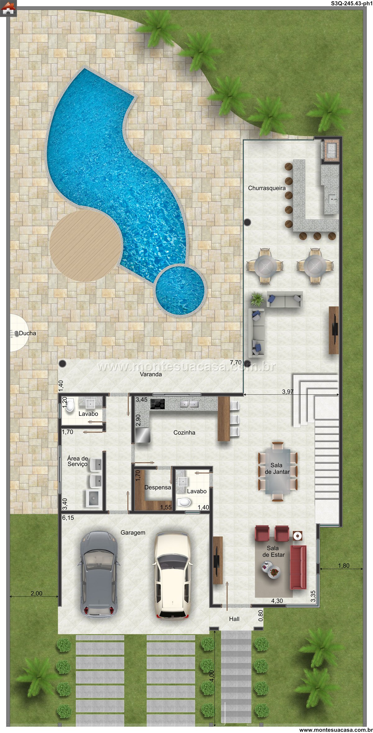 Este projeto de sobrado de 245.43m² foi meticulosamente planejado para oferecer conforto, praticidade e sofisticação em dois níveis. A planta distribui os ambientes de forma harmoniosa, criando uma fluidez que atende perfeitamente às necessidades de uma família moderna, promovendo tanto a convivência quanto a privacidade.