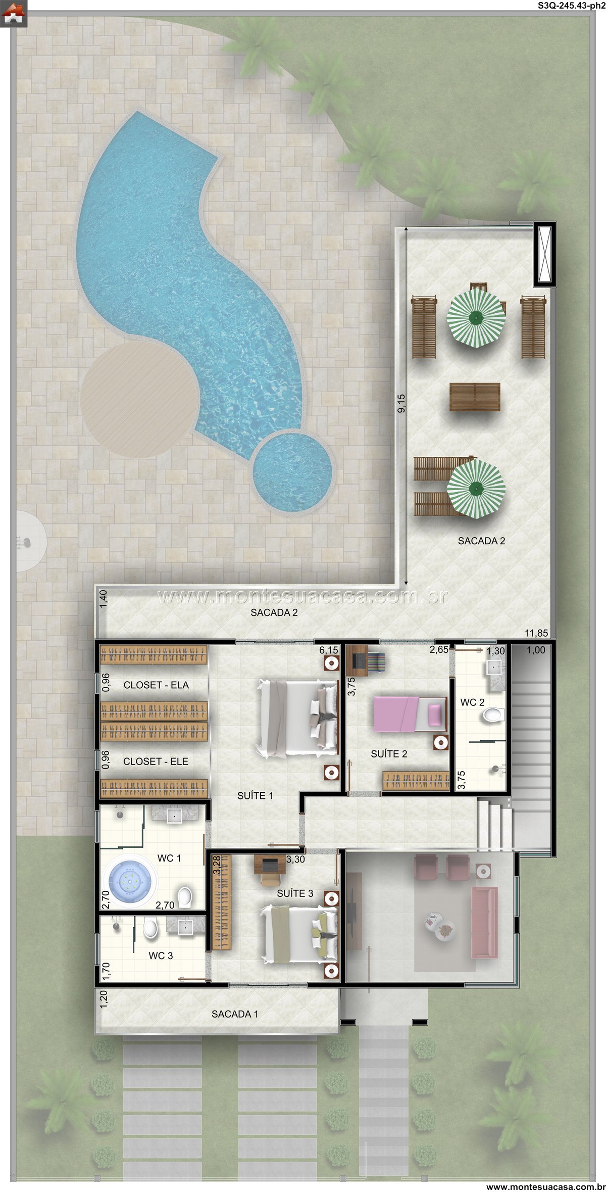O pavimento superior é dedicado ao descanso e à privacidade, abrigando três quartos. Destaque para a Suite 1, um refúgio espaçoso com 6.15m x 3.75m, acompanhada de um closet. A Suite 2, com dimensões de 3.75m x 2.85m, também oferece conforto e privacidade. Um terceiro quarto complementa o andar, atendendo perfeitamente a filhos ou hóspedes. Dois banheiros sociais (WC 1, WC 2 e WC 3) servem os dormitórios, assegurando praticidade para todos os moradores. A sacada neste nível adiciona um charme extra ao projeto, proporcionando um espaço ao ar livre privativo.