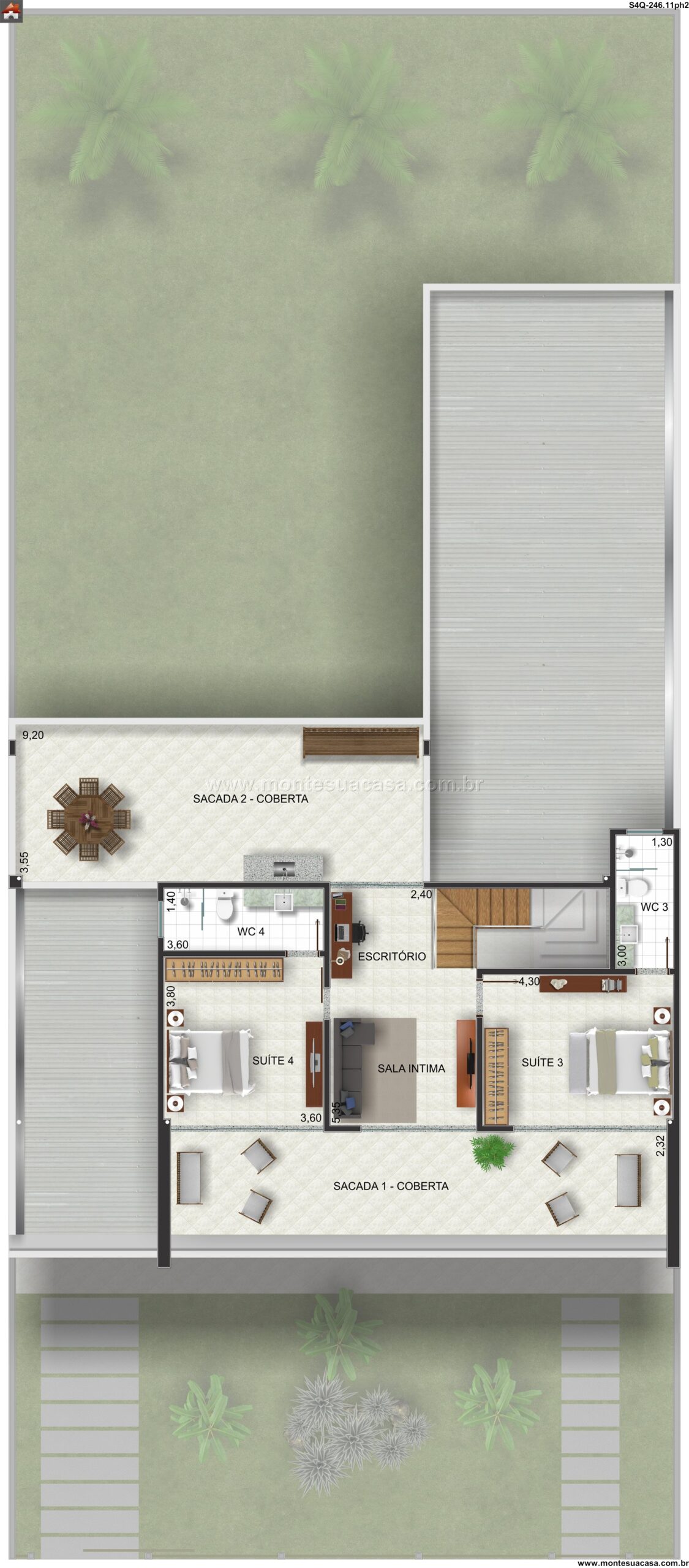 O projeto oferece uma planta bem distribuída, com quatro suítes que garantem privacidade e comodidade para todos os moradores. A suíte master é um destaque, proporcionando um refúgio pessoal com amplas dimensões. A sala íntima e a sala de estar principal se conectam de forma fluida, promovendo integração para momentos em família. Um escritório dedicado oferece o ambiente perfeito para o trabalho ou estudos, enquanto as duas sacadas cobertas ampliam a área de lazer e permitem o aproveitamento do espaço externo.
