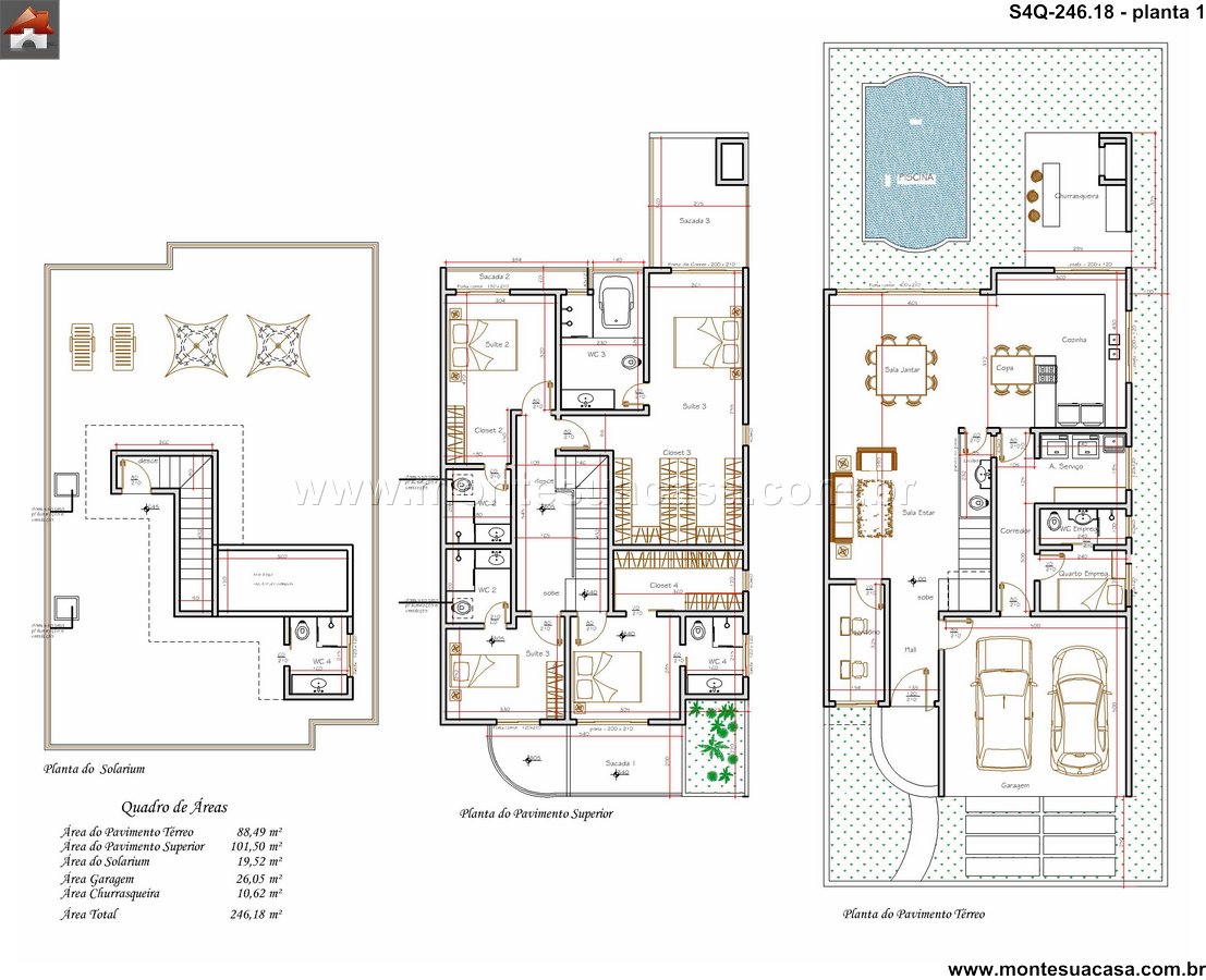 Destaque para o solarium, uma área exclusiva de 19.52 m² projetada para aproveitar a luz solar e proporcionar momentos de relaxamento. A área de churrasqueira, com 10.62 m², é perfeita para encontros descontraídos e refeições ao ar livre, integrando-se suavemente ao restante do terreno. A garagem, com seus generosos 26.05 m², garante comodidade e segurança para os veículos. Estes espaços complementares enriquecem o dia a dia, oferecendo diferentes opções de lazer e entretenimento sem a necessidade de sair de casa.