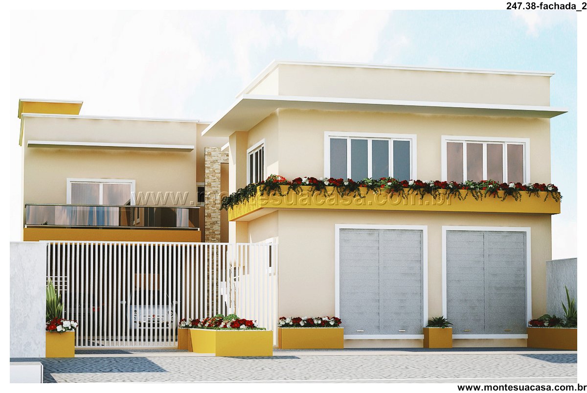 Residência principal com ambientes integrados e garagem dupla Ao lado da área comercial, a residência principal conta com varanda, sala de estar e jantar integradas, cozinha funcional, área de serviço e garagem para dois veículos. A circulação é fluida e favorece o conforto familiar. No segundo pavimento, há três dormitórios, sendo uma suíte com closet e sacada privativa, além de sala de TV e dois banheiros sociais.